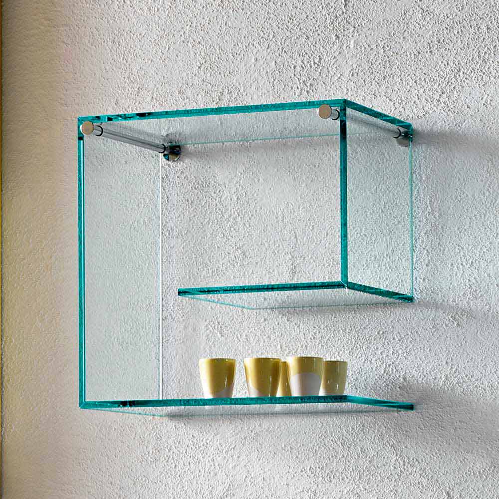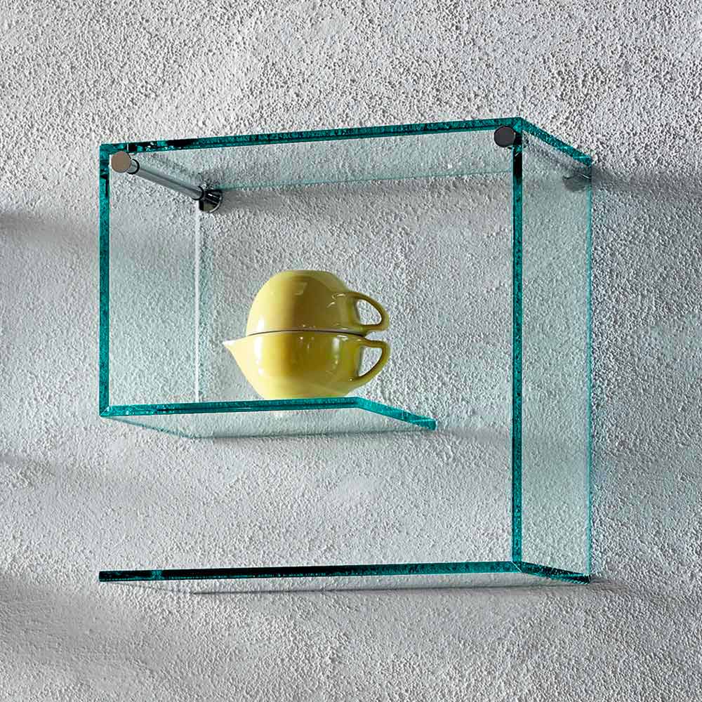 Este par de estantes de pared se caracteriza por su diseño versátil y geométrico realizado íntegramente en vidrio flotado de 10 mm de espesor en el acabado transparente.