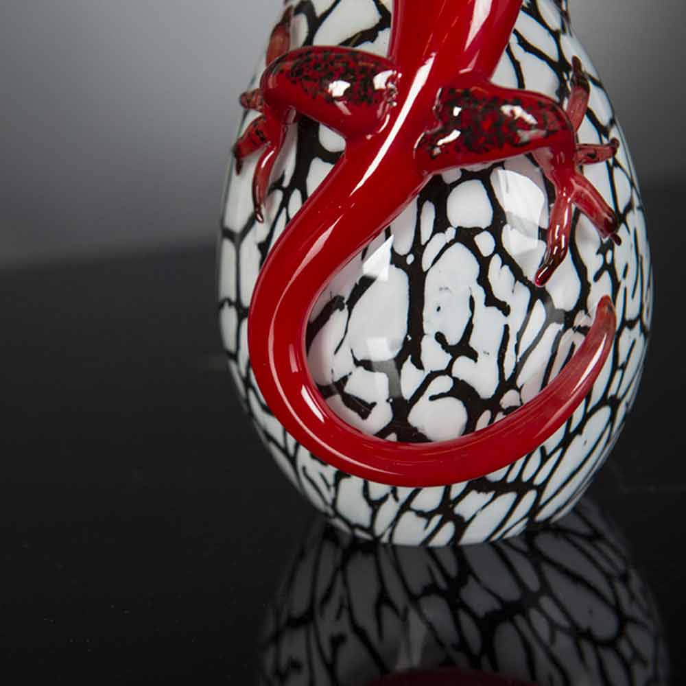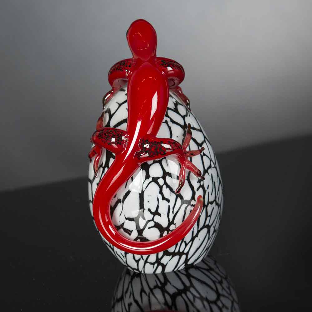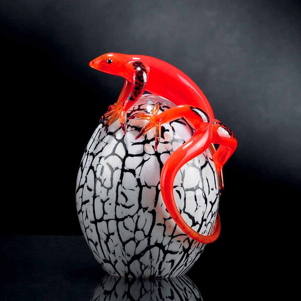 Estatua en forma de huevo con gecko fabricada en Italia en vidrio blanco, negro y rojo . Un excéntrico elemento decorativo para los espacios de tu hogar capaz de dar un toque original gracias a su fuerte personalidad creativa . Su estética inusual y colorida sin duda representa su punto fuerte por lo que es una idea perfecta para quienes aman enriquecer los ambientes del hogar de una manera original y elegante al mismo tiempo gracias a un objeto subrayado por líneas exclusivas y la elegancia atemporal del vidrio y sus maravillosos colores. El resultado es un simple accesorio decorativo para el hogar capaz de enriquecer el estilo de cualquier hogar con un toque de color gracias a su alma moderna y diseño vanguardista .