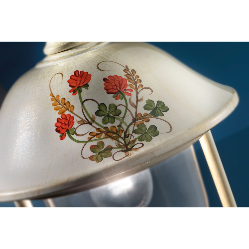 Esta lámpara de suspensión para exterior está realizada íntegramente en aluminio decorada con flores pintadas a mano para un estilo clásico y armonioso entre formas y colores.