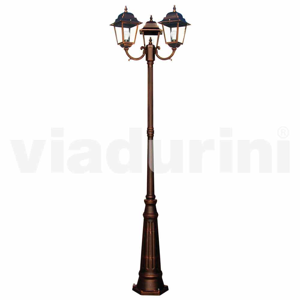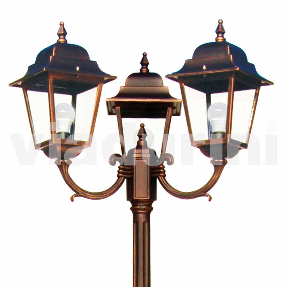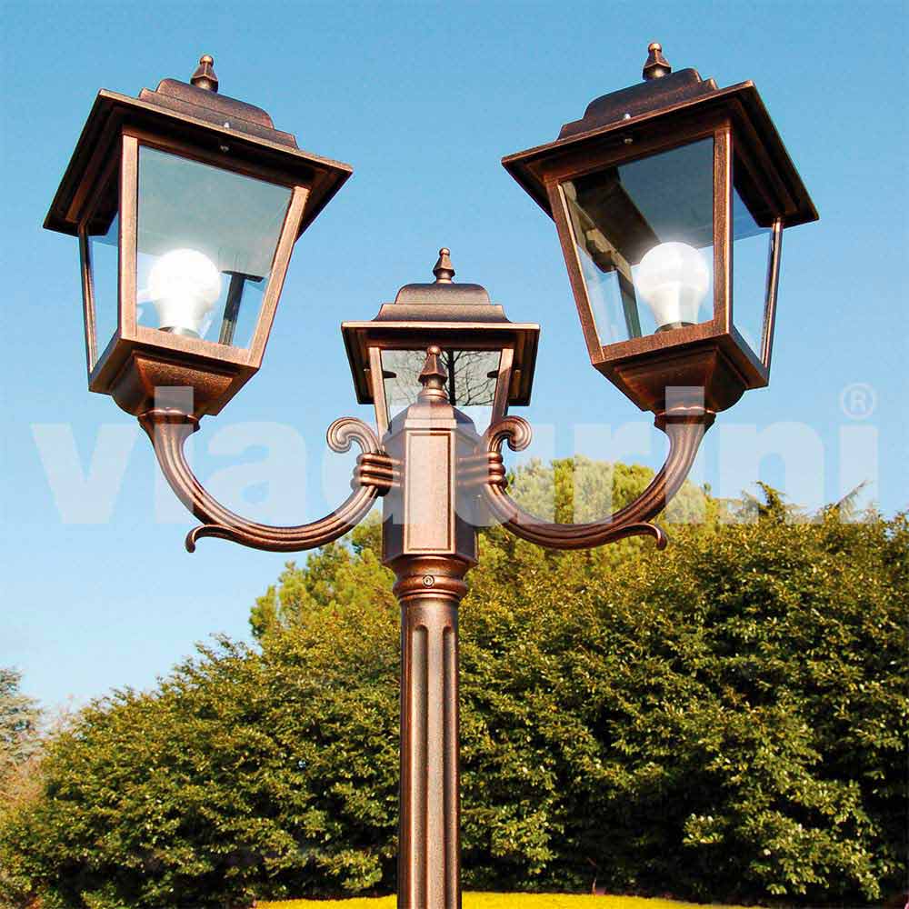 Farola de exterior clásica de aluminio fabricada en Italia, Aquilina Aquilina es una lámpara de jardín de tres luces hecha a mano en Italia con material de alta calidad: estructura de aluminio inyectado y difusor de cristal disponible: transparente o arenado.