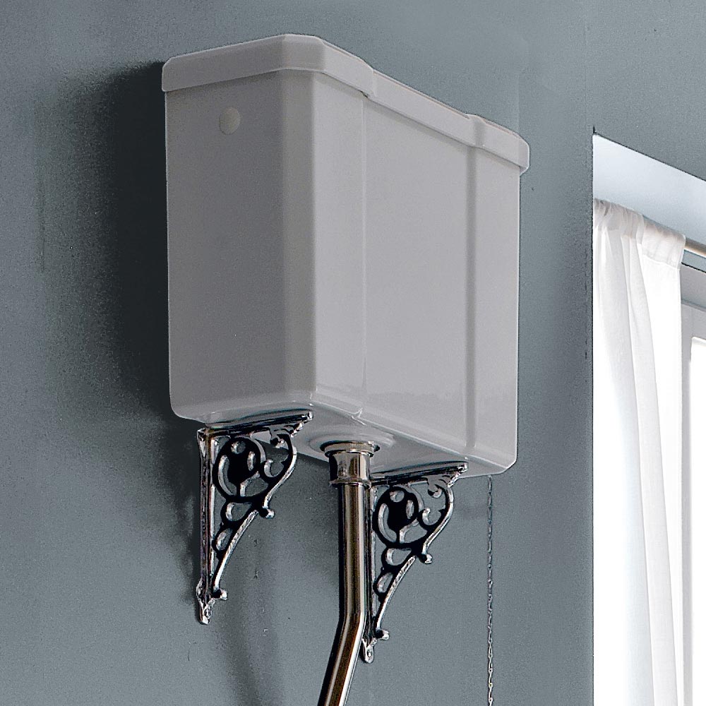 WC de pie de estilo clásico con caja de cerámica Marwa alta blanca, hecho en Italia.