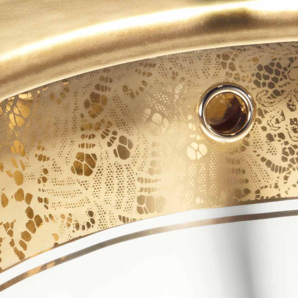 Fregadero incorporado en el baño hecho en Italia en arcilla de fuego hecho a mano en Italia con raya decorada y drenaje de oro de 24 k.
