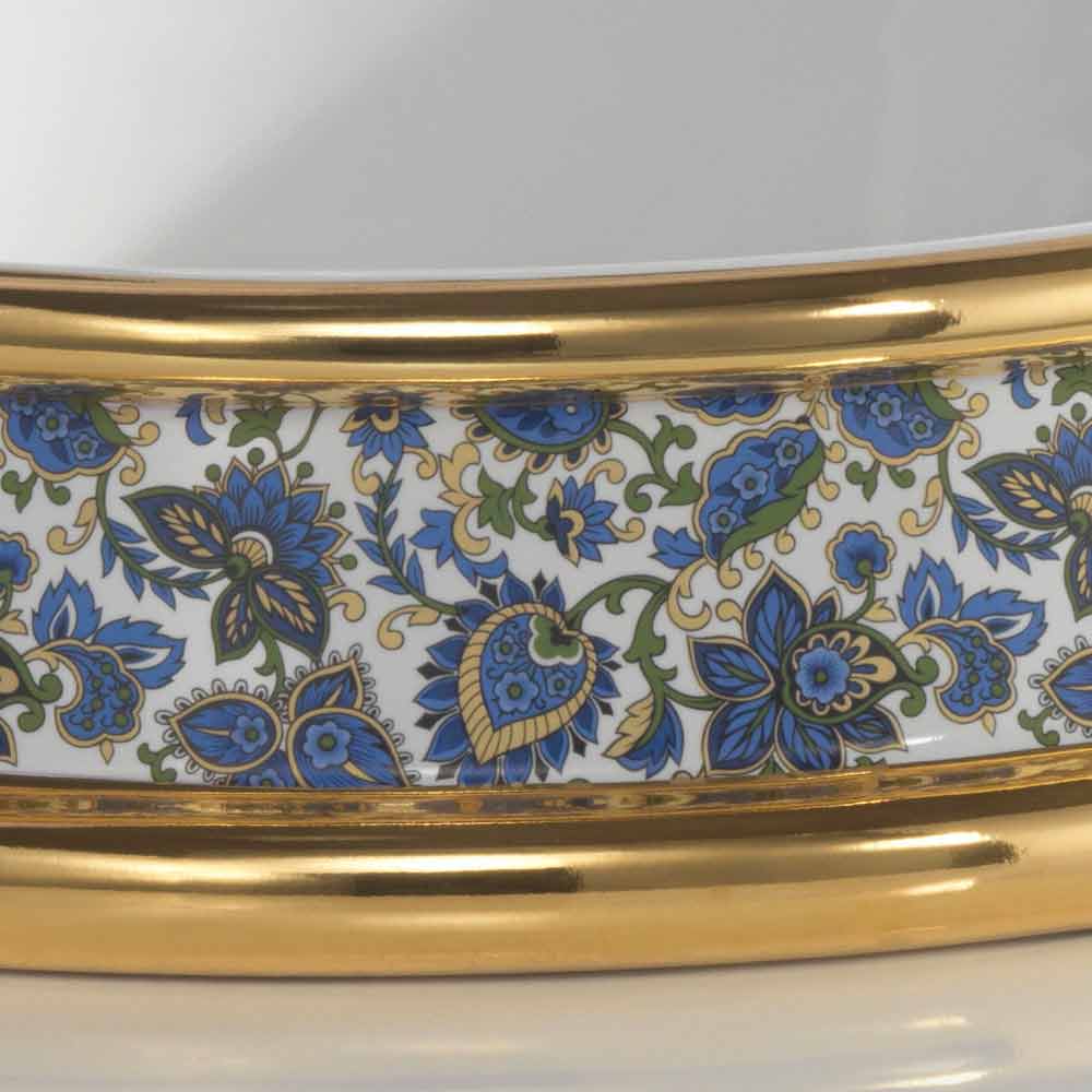 Fregadero semirecesado para baño hecho en Italia en arcilla de fuego, hecho a mano, con rayas con una decoración floral azul y dorada y anillos pintados en oro de 24k.