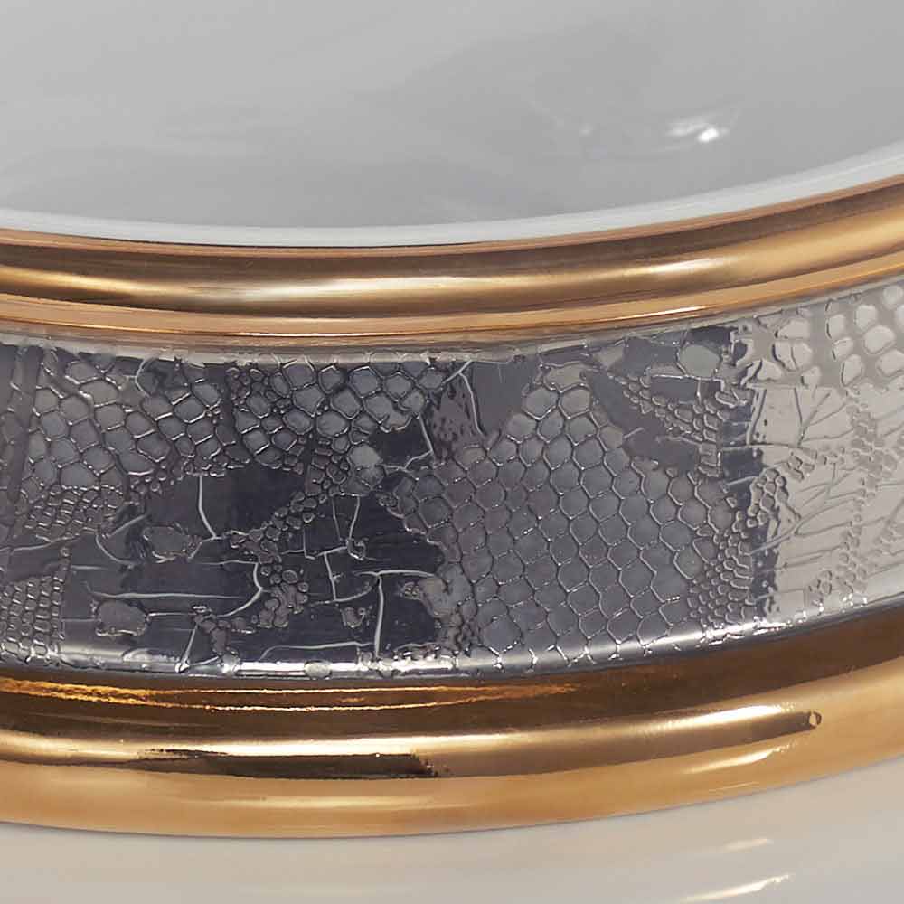 Fregadero semirecesado para baño fabricado en Italia en arcilla fuego, hecho a mano, con encaje de platino y anillos pintados en oro de 24k.