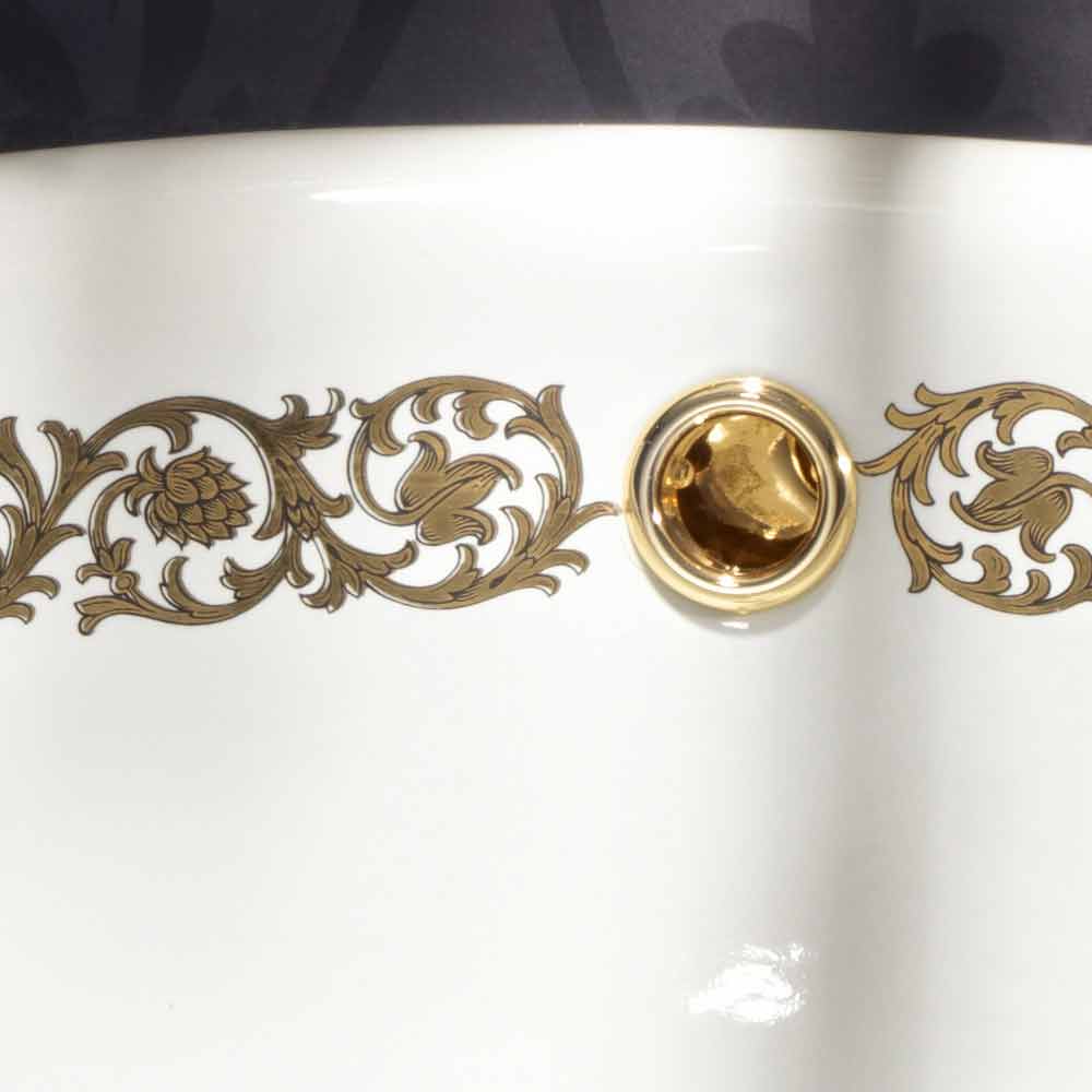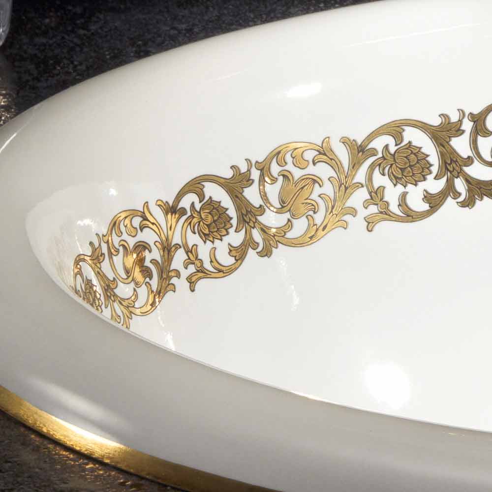 Fregadero incorporado en el baño hecho en Italia en arcilla de fuego, hecho a mano, decorado, con raya en cono de pino dorado y borde de oro de 24 k.