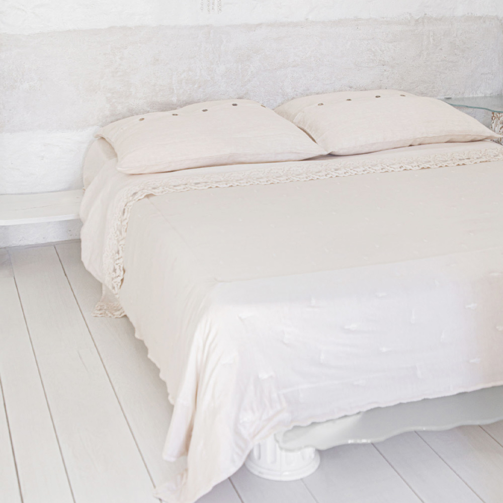 Así, a través de la atención al detalle y un diseño genuino que apunta a la esencia de la belleza, nace un producto auténtico y artesanal , de la más alta calidad para las materias primas seleccionadas, como el lino más puro y el algodón más suave. La imperfección natural del material denota así el valor de la simplicidad , encerrada en una artesanía elegante y delicada para una experiencia sensorial sublime y sugerente.
