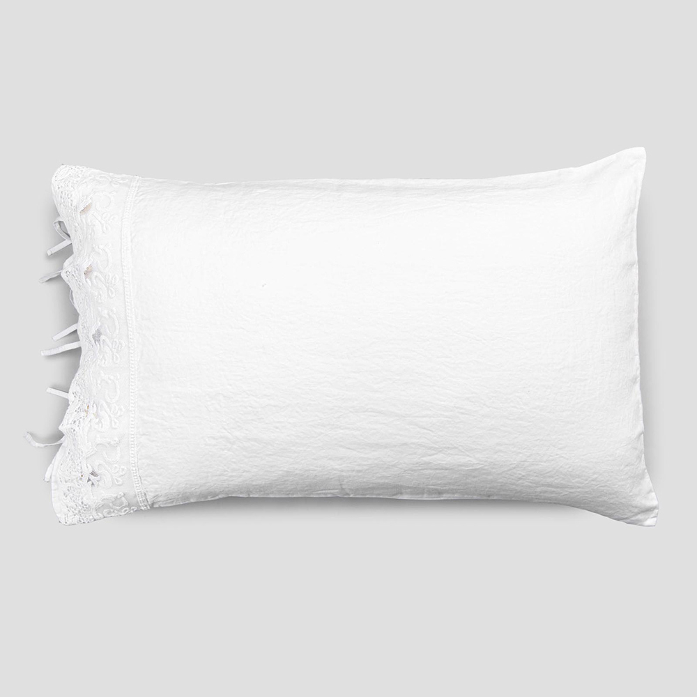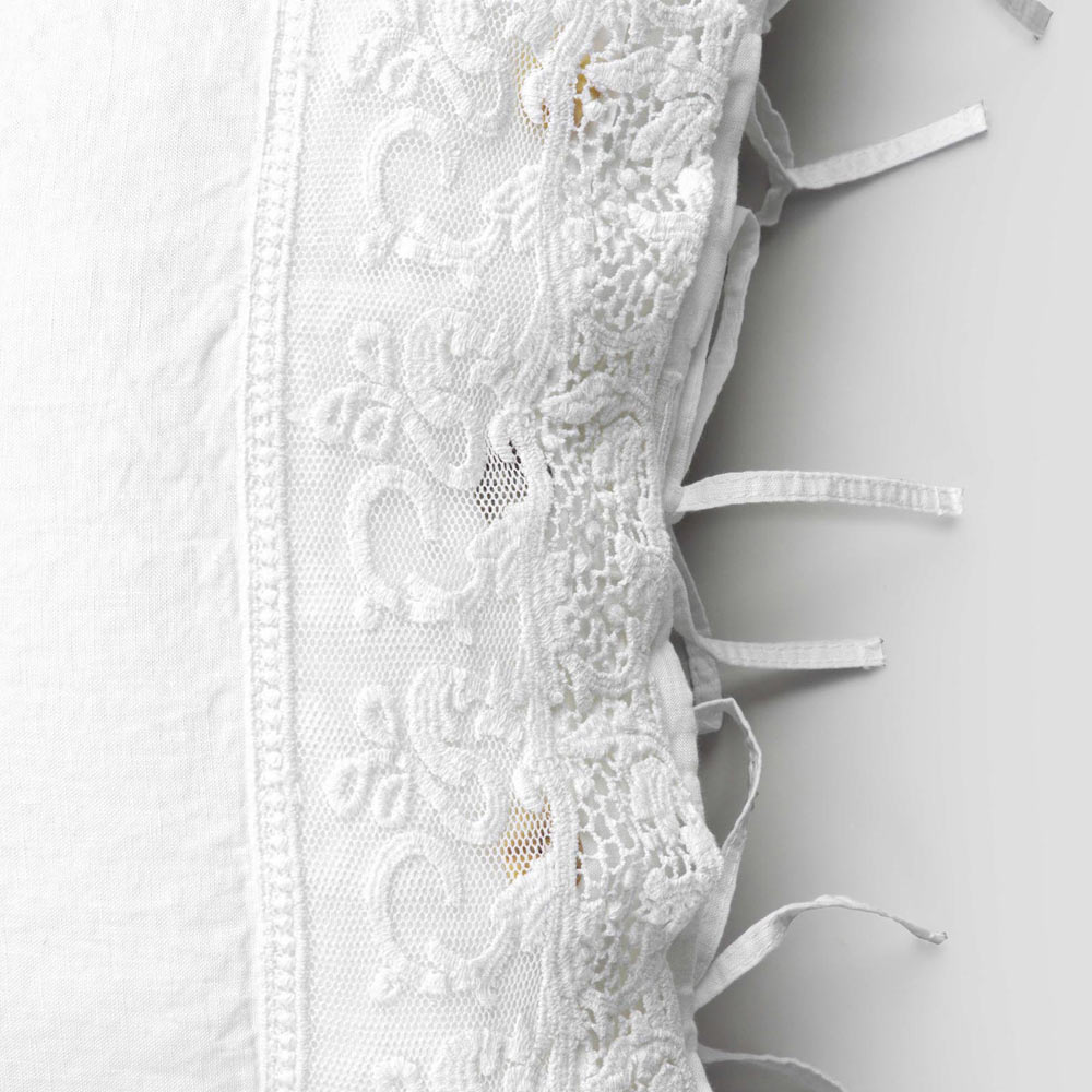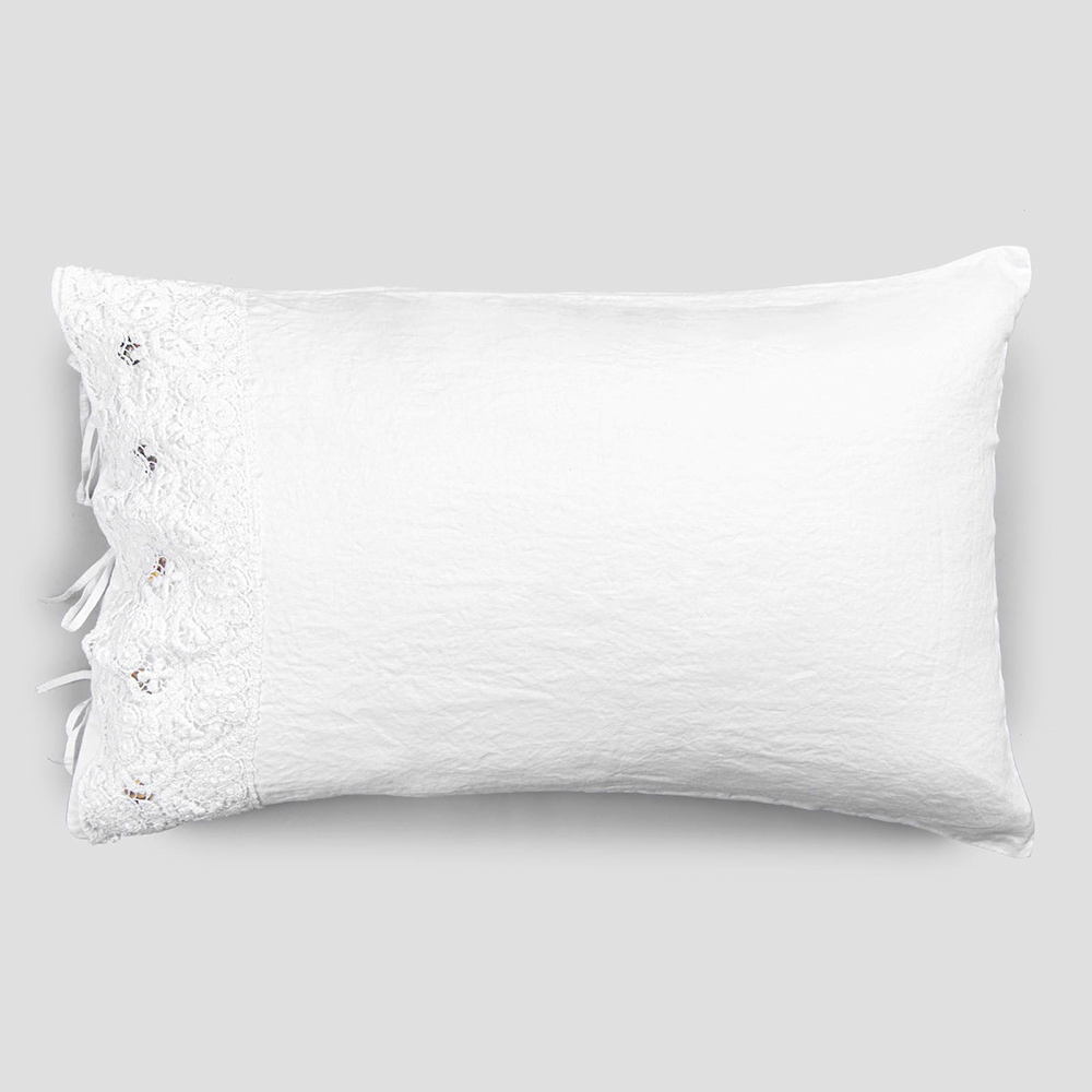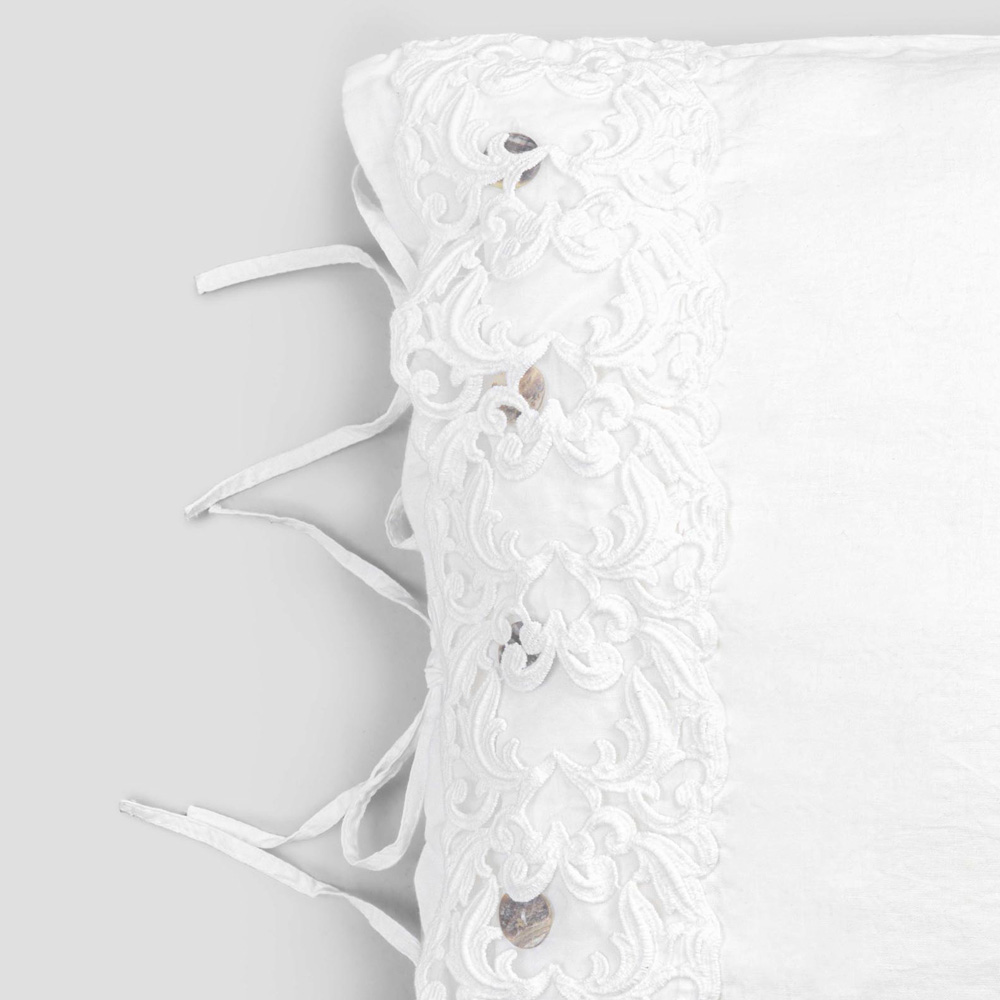 El valor de la tradición se combina con el estilo de vida moderno en esta funda de almohada de lino blanco adornada con encaje de tul o farneso o crochet cosidos en la solapa decorativa , botones Agoya de nácar y cierre de cordones.