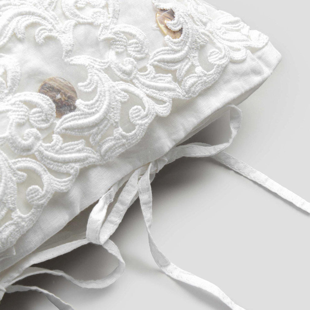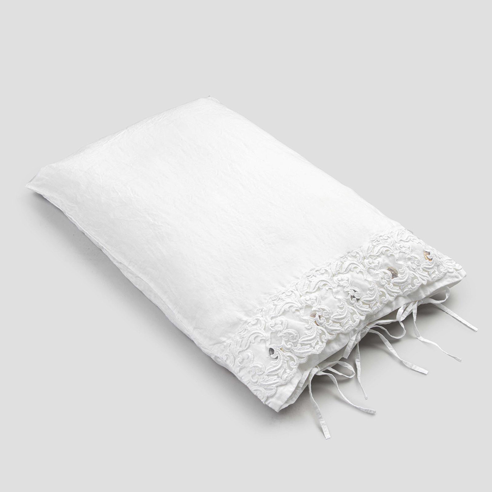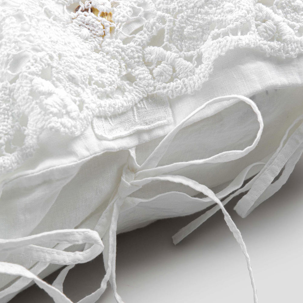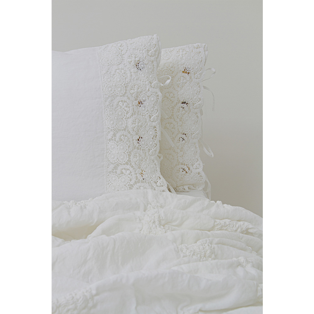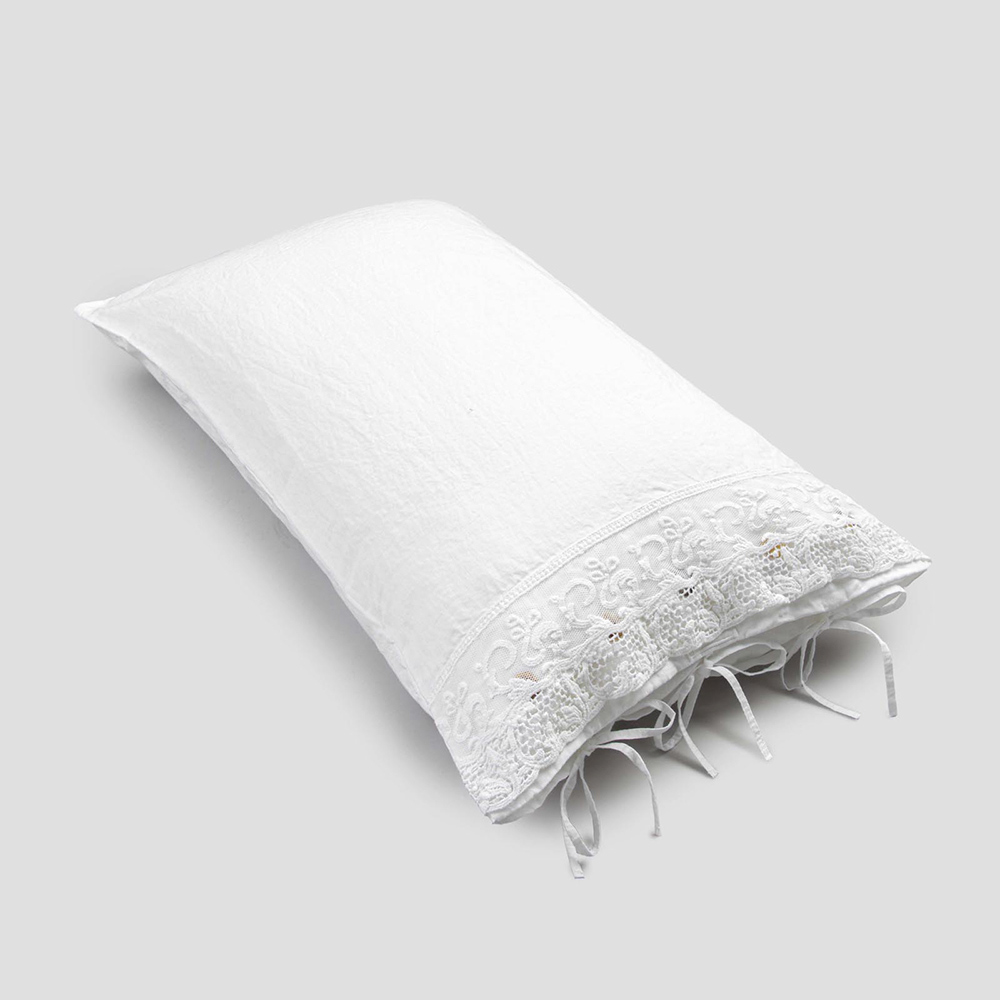 El valor de la tradición se combina con el estilo de vida moderno en esta funda de almohada de lino blanco adornada con encaje de tul o farneso o crochet cosidos en la solapa decorativa , botones Agoya de nácar y cierre de cordones.