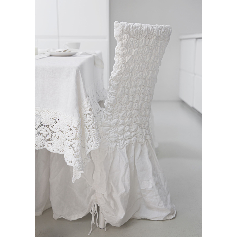 El valor de la tradición se une al estilo de vida moderno con esta funda de silla ligera de lino gofrado con volante disponible en varios acabados .