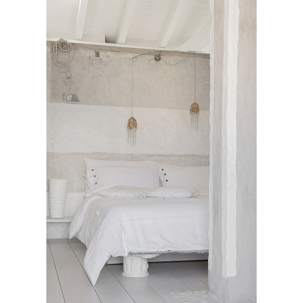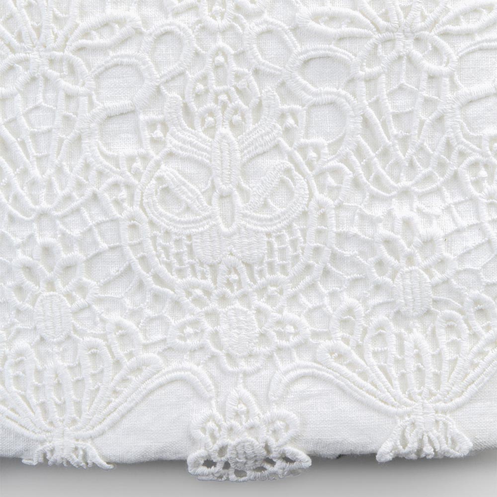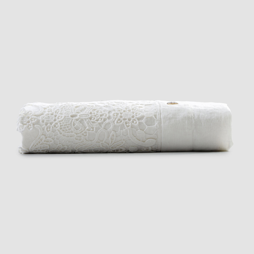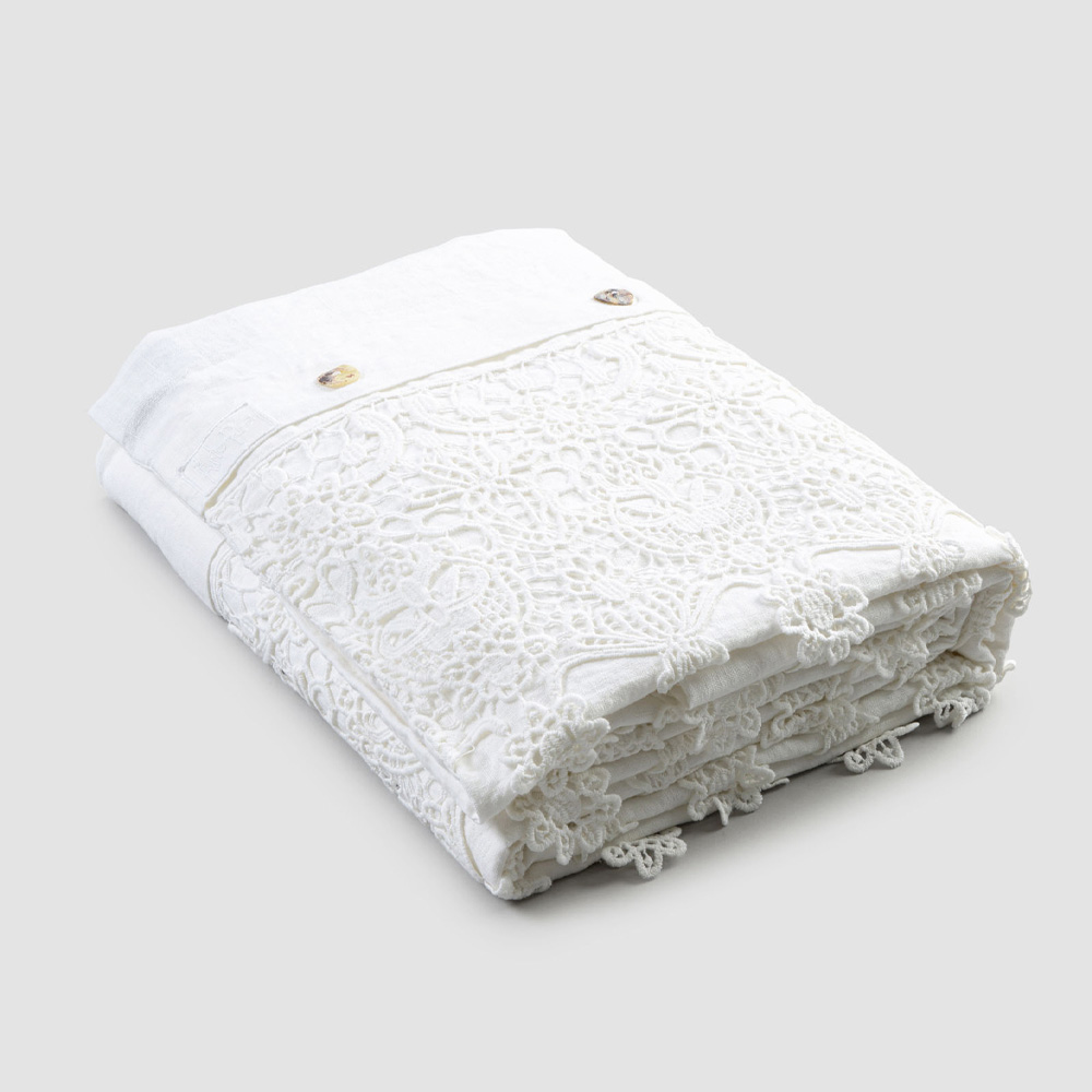 Funda nórdica doble en lino blanco con gotas de encaje, diseño de lujo artesanal made in Italy.