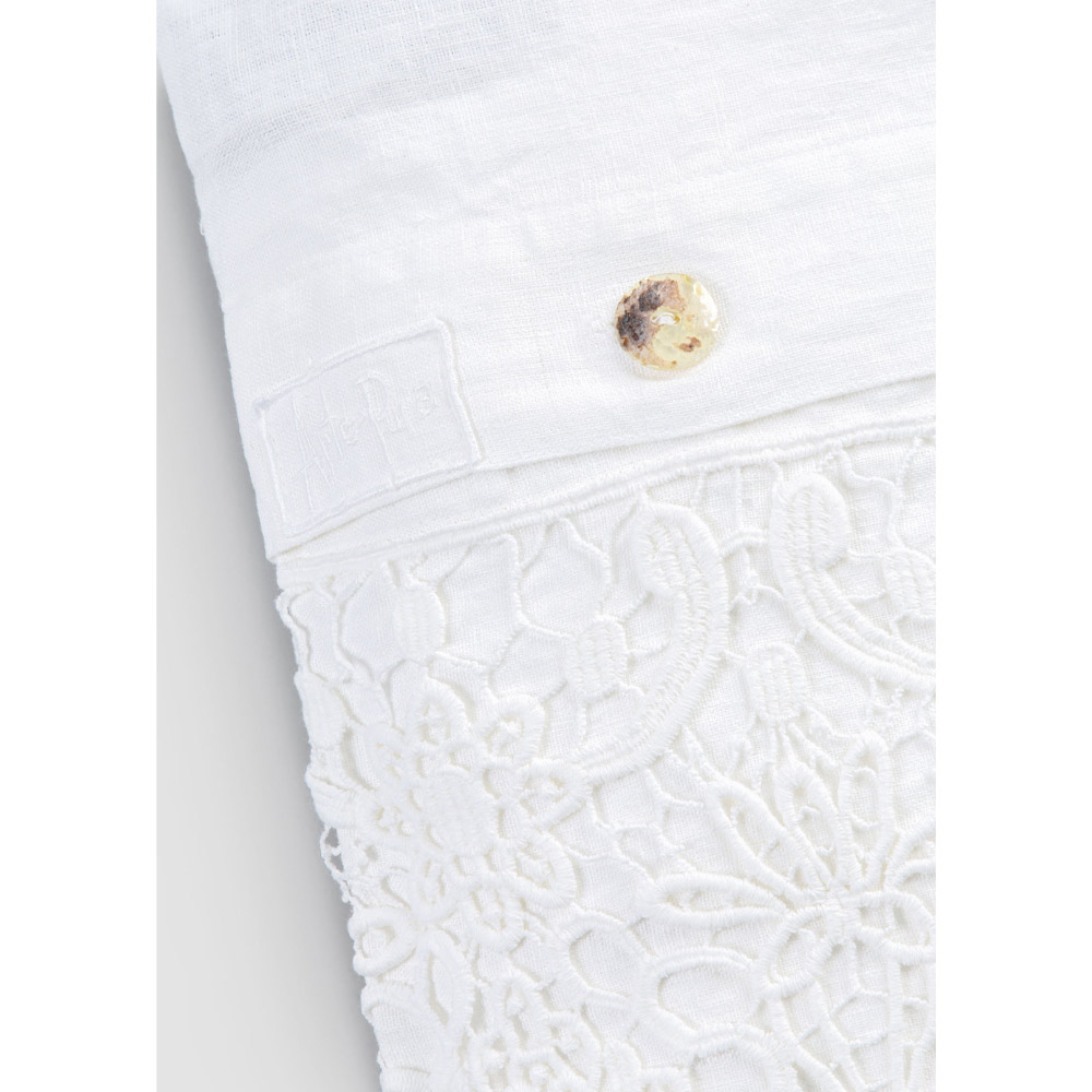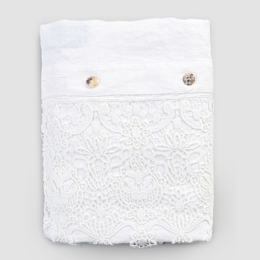 El valor de la tradición se une al estilo de vida moderno con este pesado saco contenedor de lino blanco adornado con encaje y botones de nácar Agoya.
