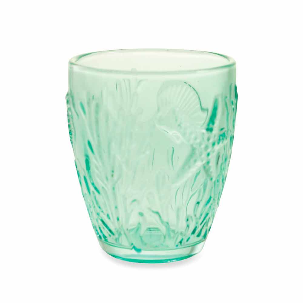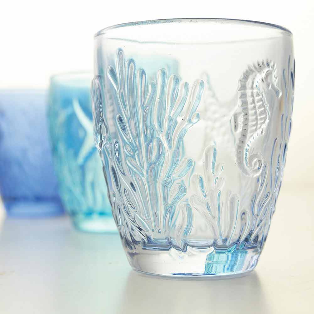 mar , sino que lo recupera en su totalidad, reconstruyendo en la superficie externa de las gafas su belleza simple e incontaminada: estrellas de mar, conchas, algas y corales finamente tallados para crear un efecto joya fino y refinado.