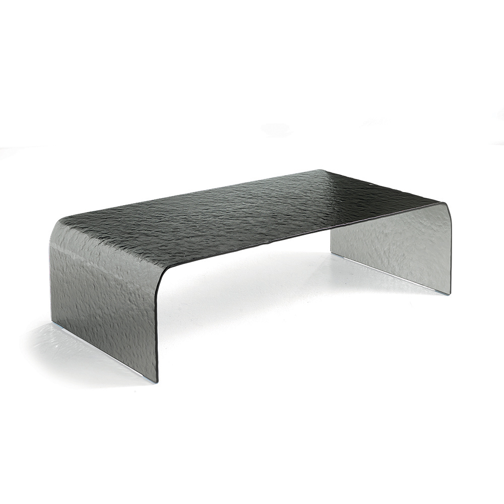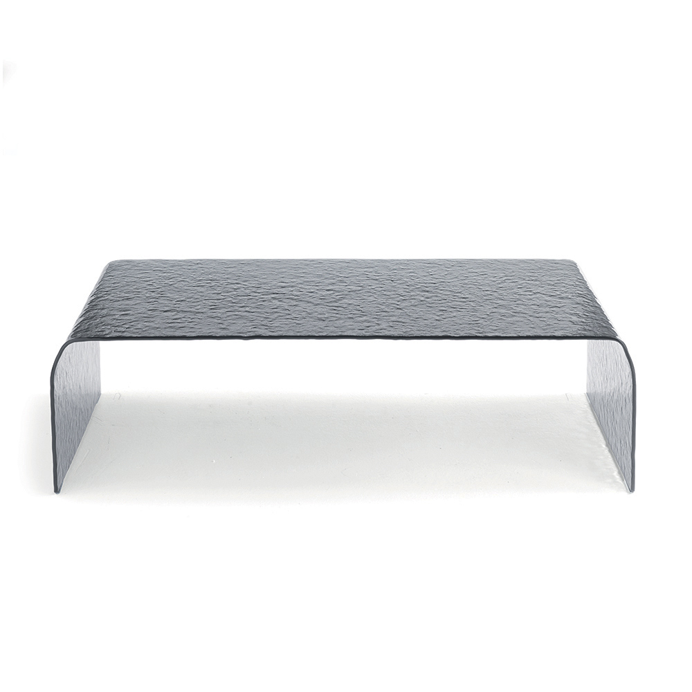 Elaborada a partir de una sola lámina de vidrio transparente curvado , esta mesa de centro presenta un refinado acabado martillado que crea un delicado juego de reflejos y profundidad. Su forma continua y sin juntas realza la pureza del material, transformando la mesa en una auténtica pieza escultórica.