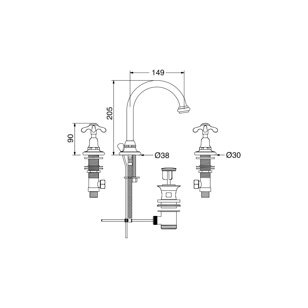 Klarisa è una fina batería de lavabo de caño alto de 3 agujeros con desagüe.