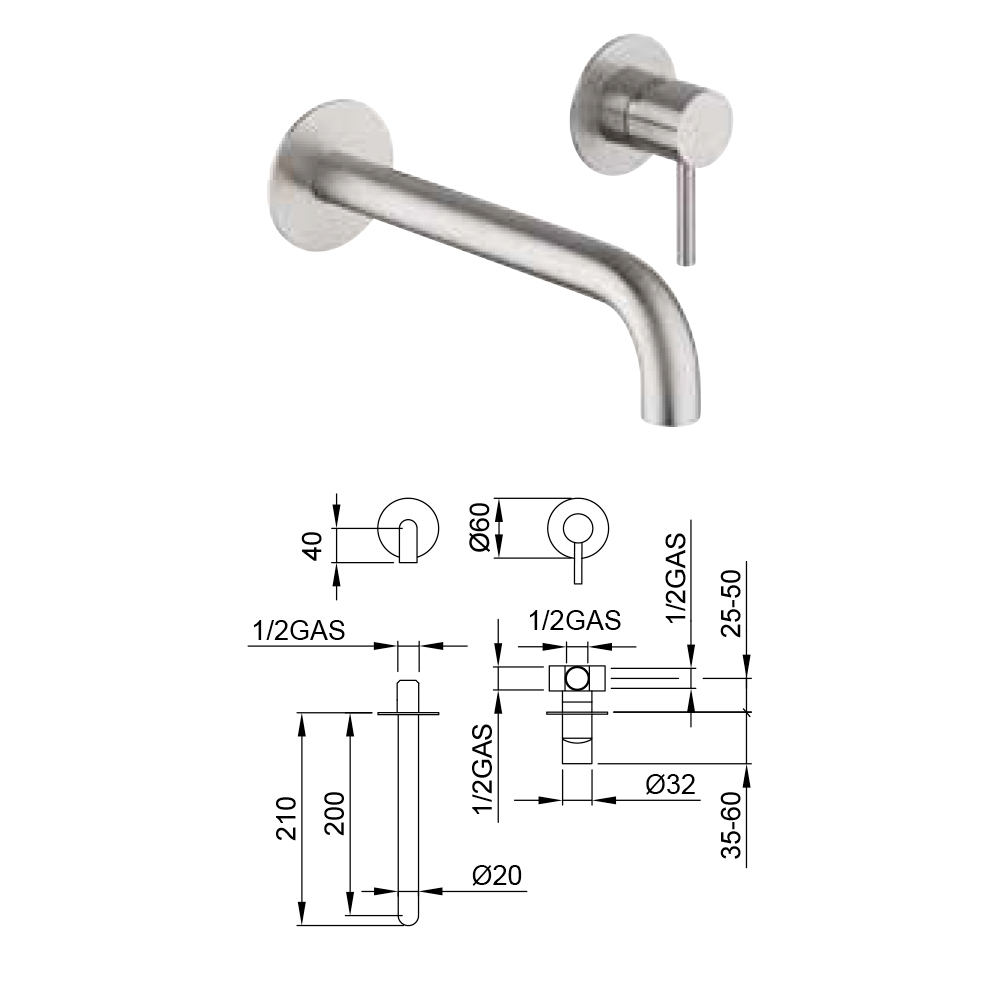 Mezclador de lavabo empotrado con caño mural, sin desagüe Made in Italy