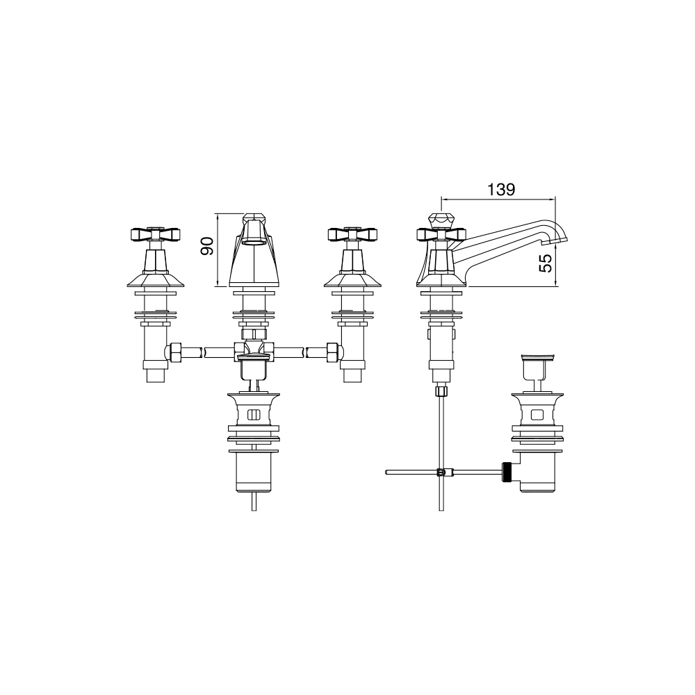 grifo de lavabo de tres agujeros con desagüe, fabricado en latón.