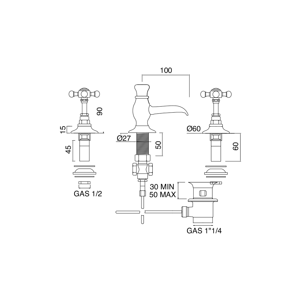 Grifo de bidé de 3 orificios con desagüe, fabricado en latón.