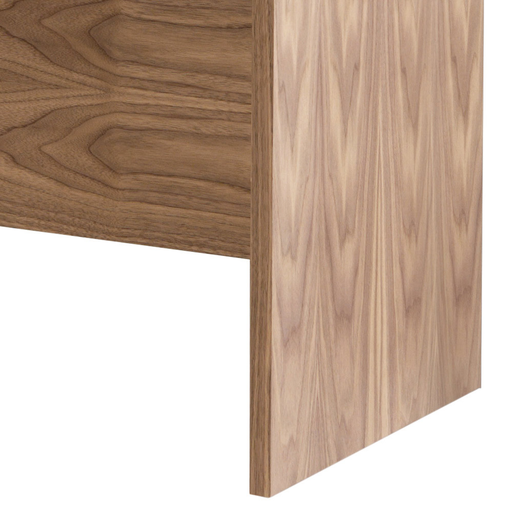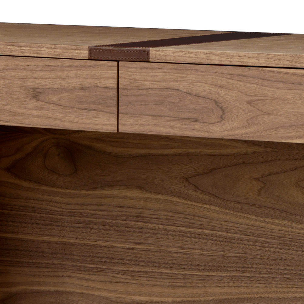 Hecho de madera contrachapada curvada chapada en nogal canaletto con inserciones frontales en cuero natural.