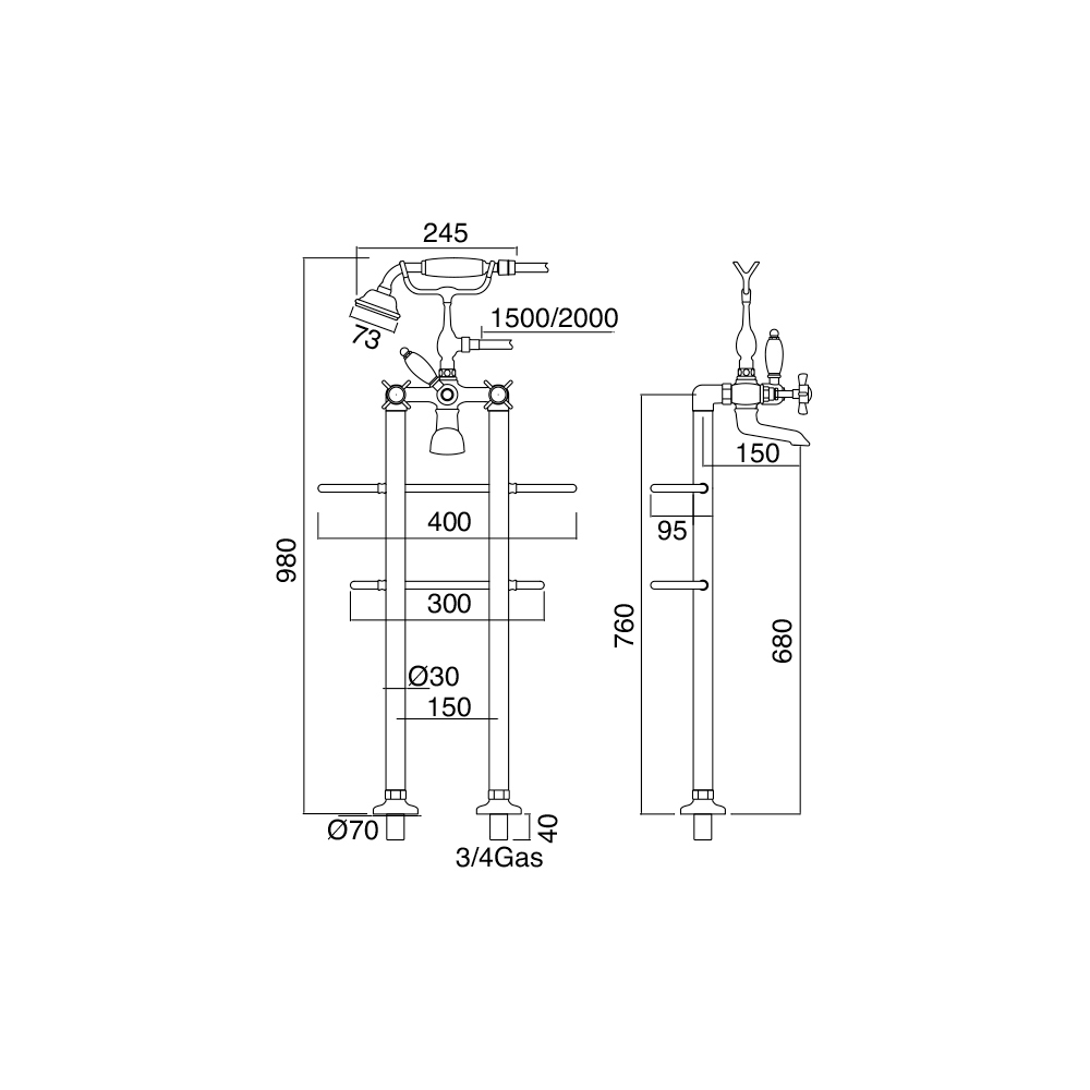 grupo de bañera de pie con toallero, teleducha y flexo.