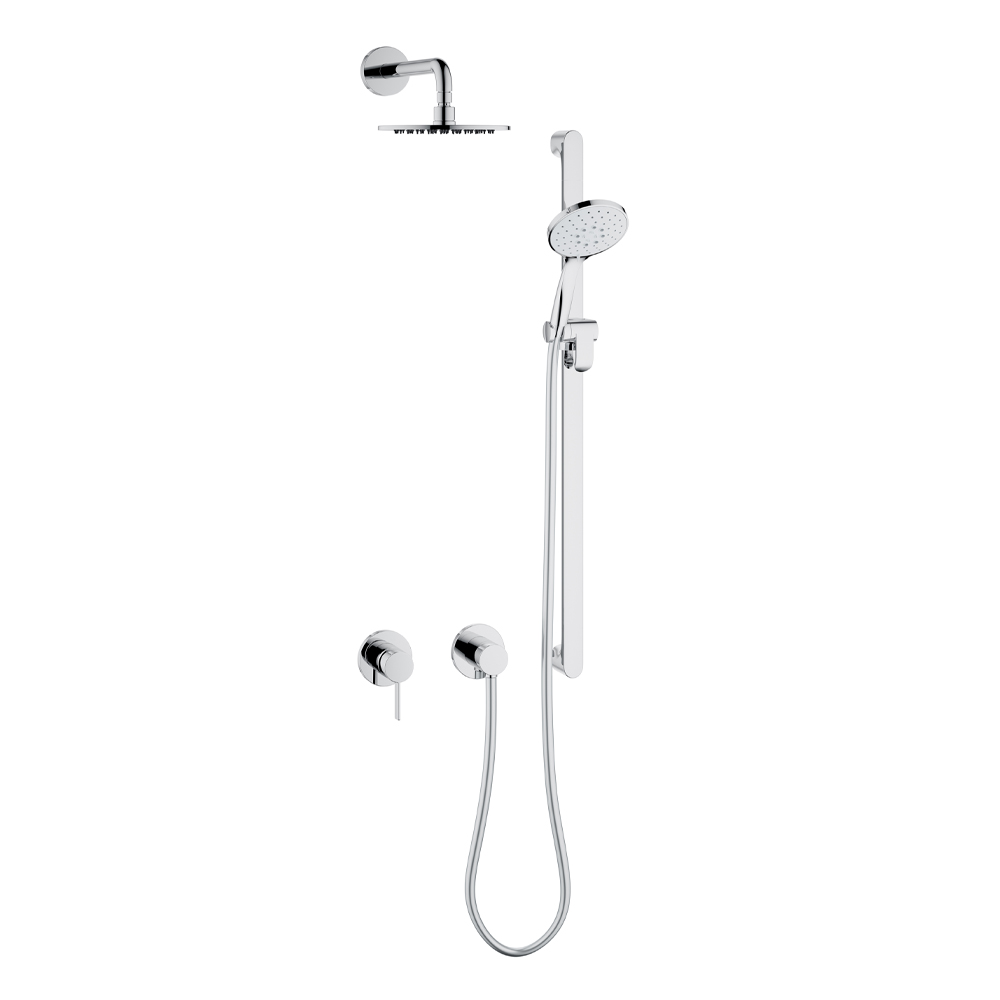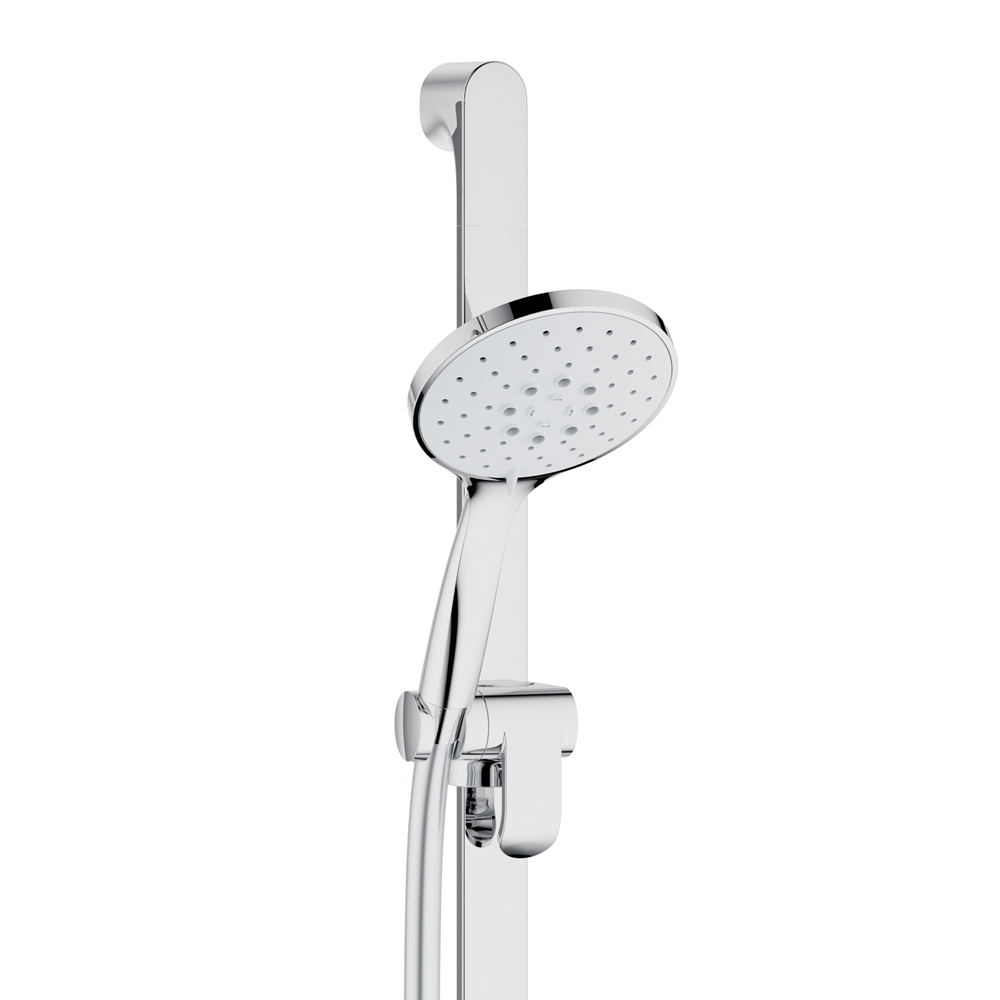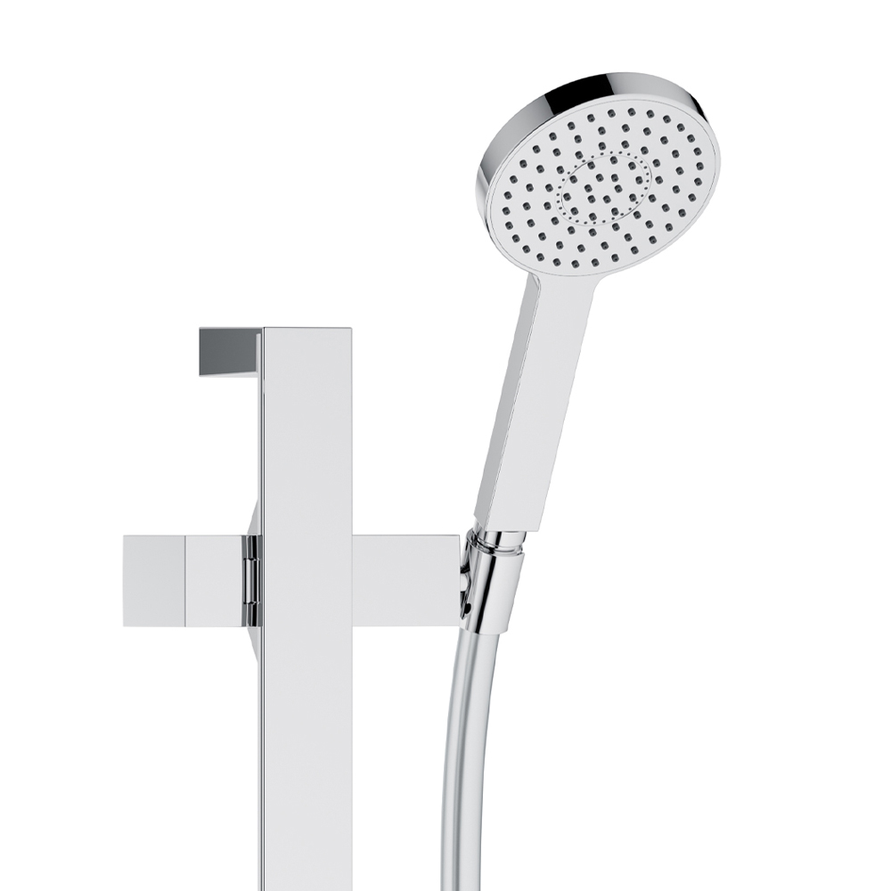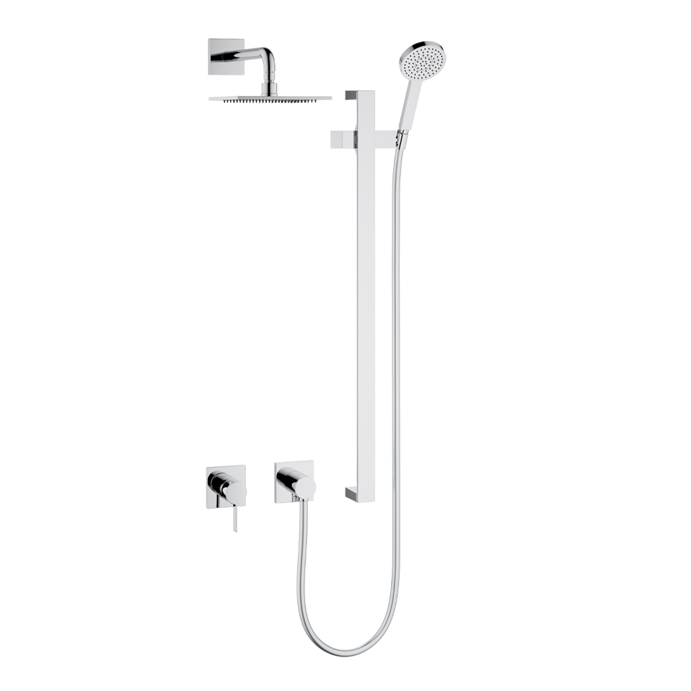 Mezclador de ducha con mezclador monomando minimal y rociador de ducha.