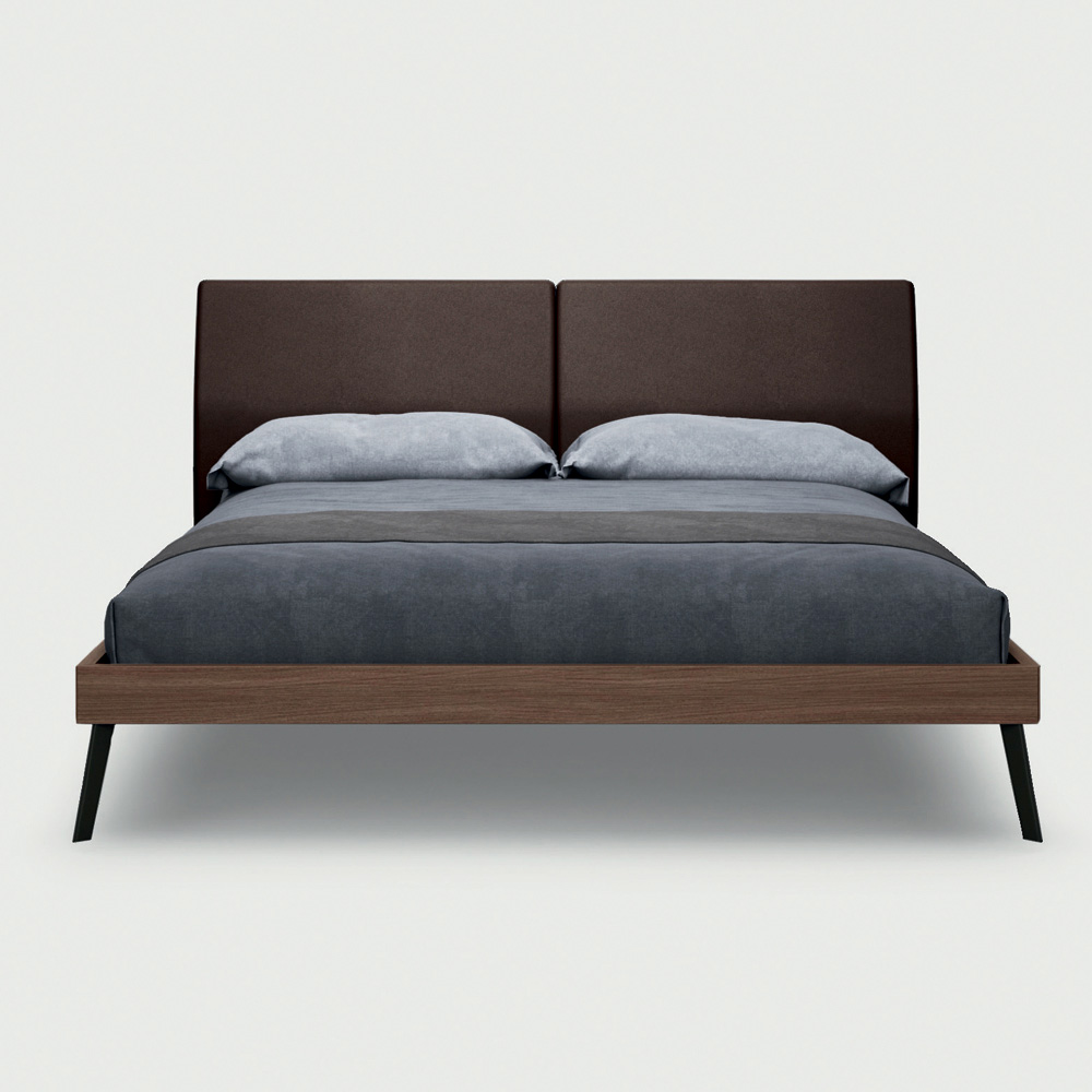 Dormitorio completo compuesto por 4 elementos íntegramente made in Italy . La composición incluye una cama doble en acabado terracota con patas de metal bruñido y cabecero acolchado tapizado en ecopiel, 2 mesitas de noche de 2 cajones cada una y una cómoda alta de 6 cajones de madera a juego con el marco de la cama. La simetría y la sobriedad son las principales características de esta moderna idea que da vida a un concepto de mobiliario romántico subrayado y envuelto en las maravillosas vetas de la madera que enriquecen la estética de la estancia con personalidad. Los elementos que rodean la cama acompañan el dormitorio con sencillez y ligereza gracias a sus sinuosas líneas que crean un ambiente tranquilo y acogedor ideal para espacios domésticos privados.