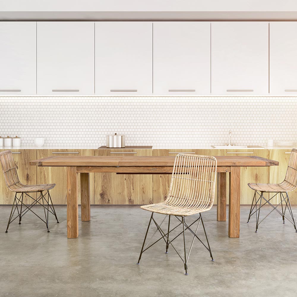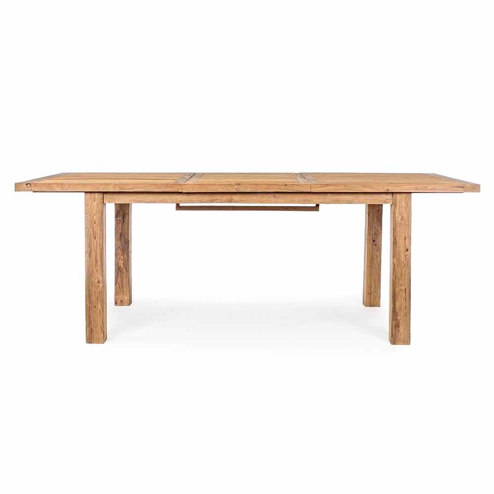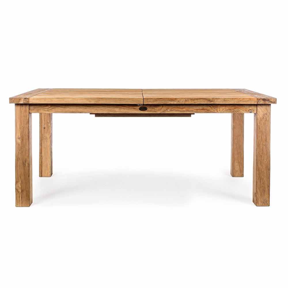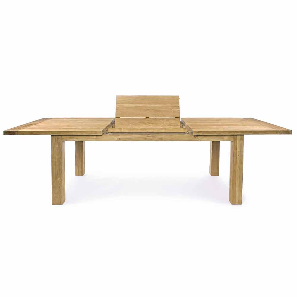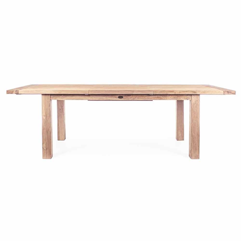 Mesa rectangular extensible de jardín en madera de teca natural reciclada, disponible en dos tamaños.