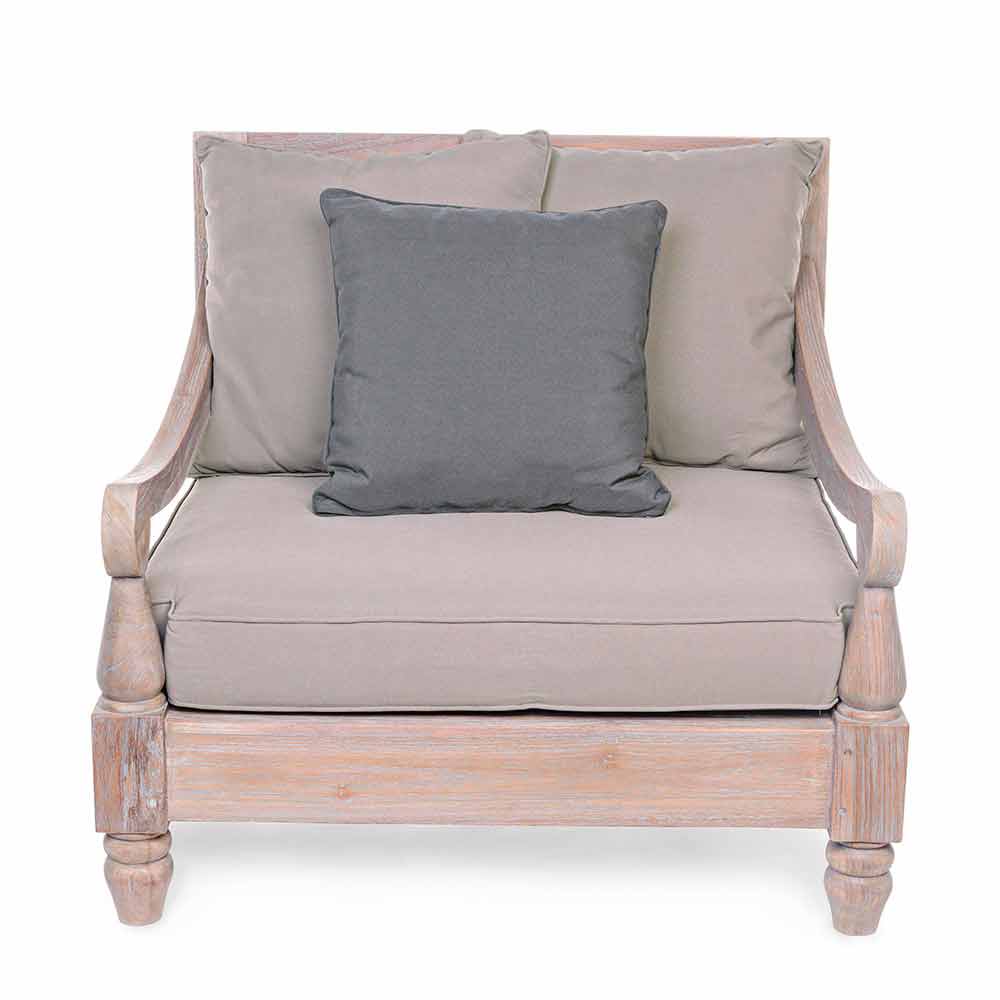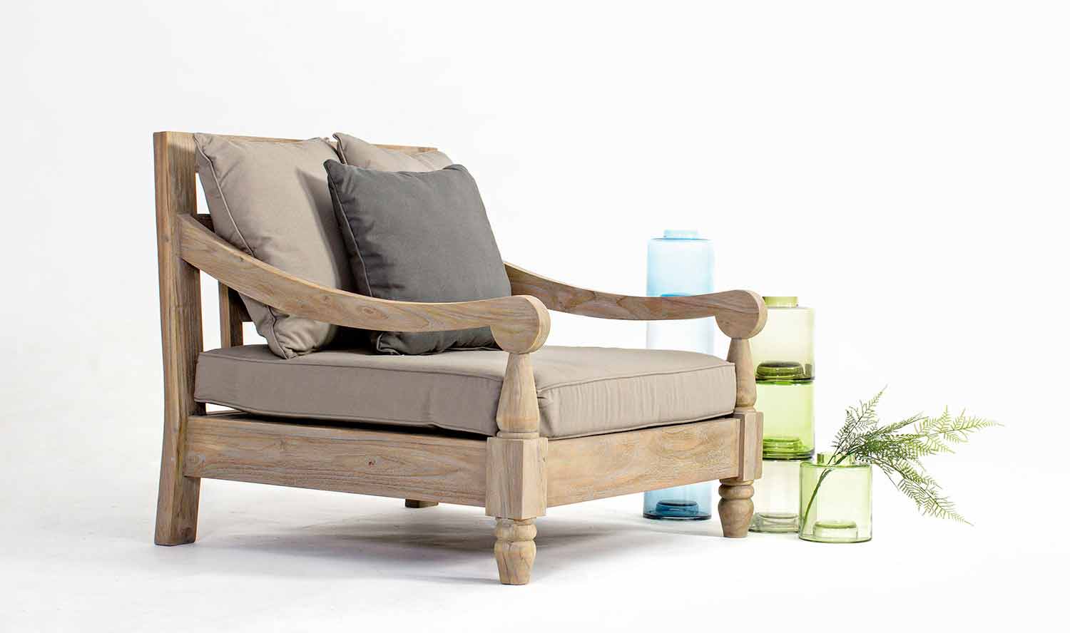 Sillón de exterior de estilo rústico, de madera de teca, con cojines de tela extraíbles.