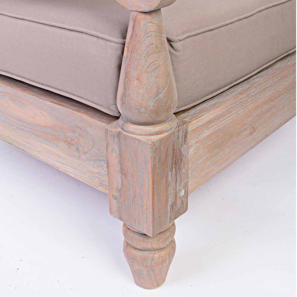 Madera de teca 100% FSC, acabado arenado y a base de agua envejecida. Cojines extraíbles con tejido olefínico resistente al sol (100% polipropileno).