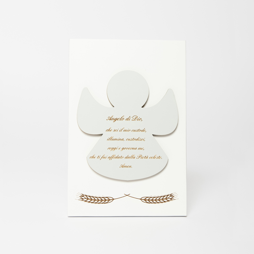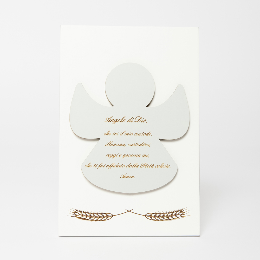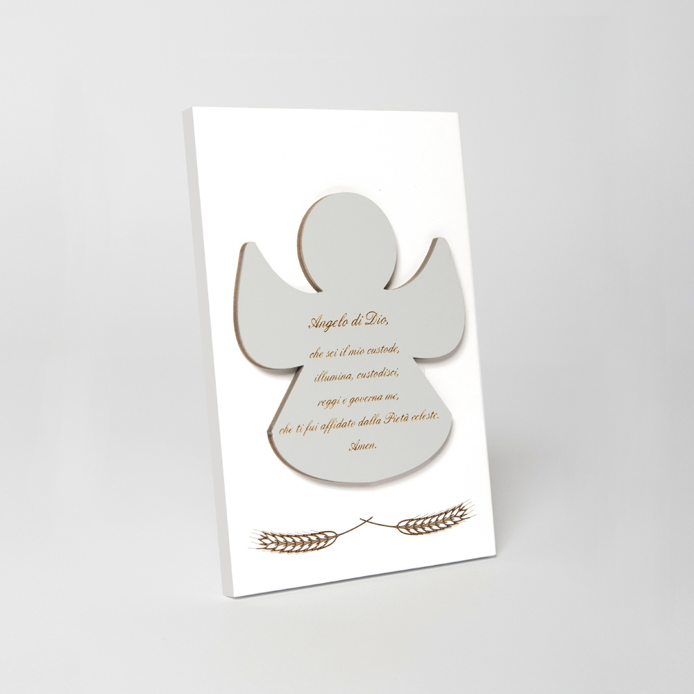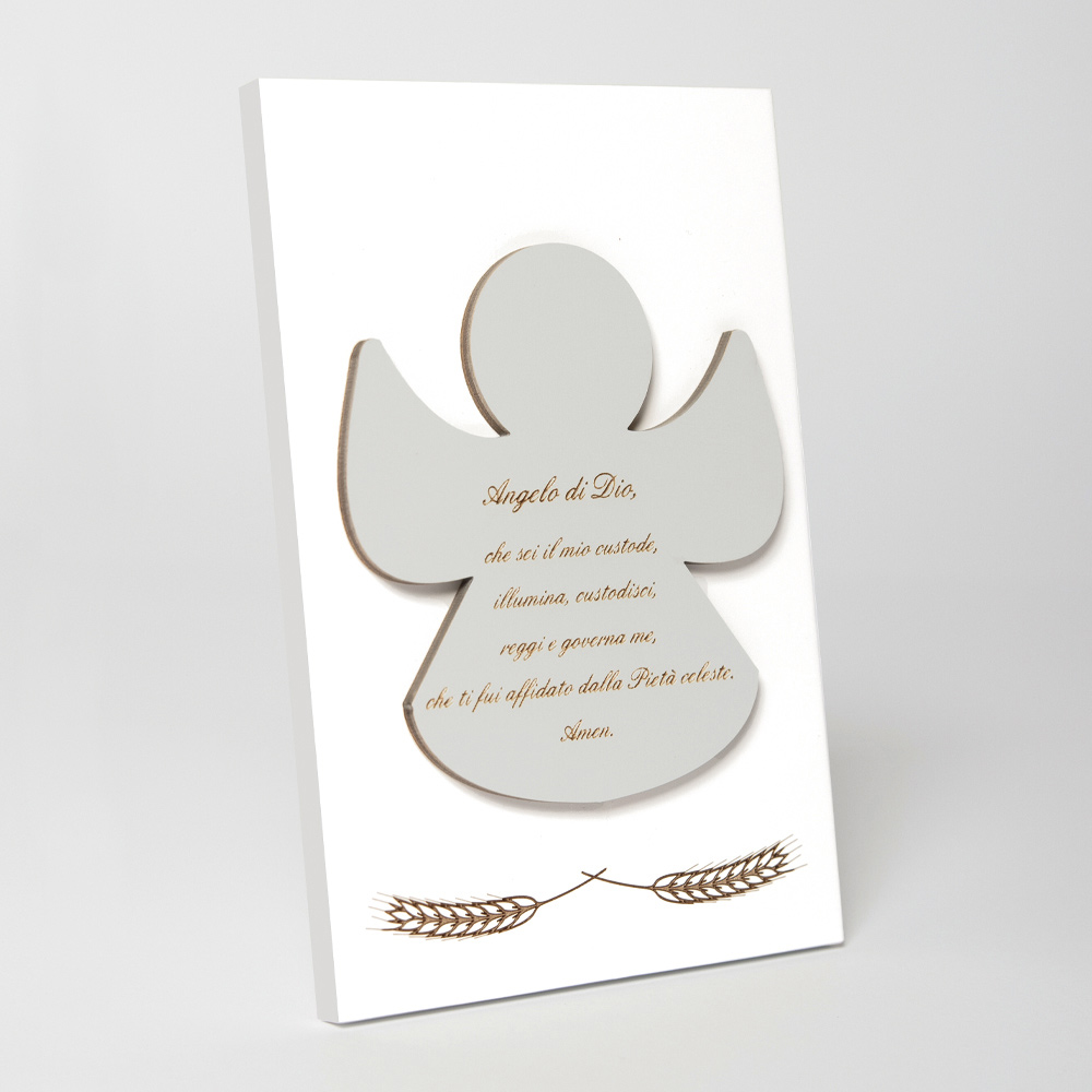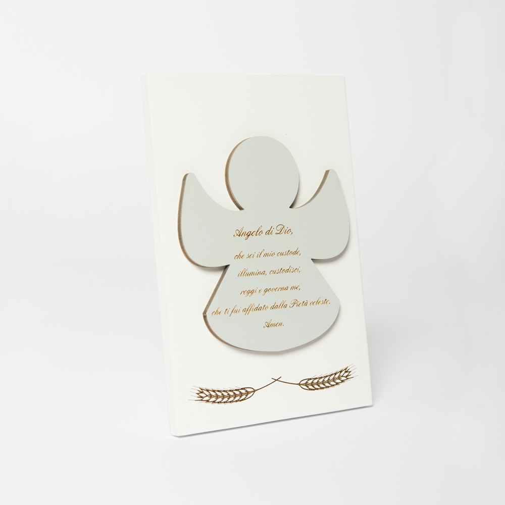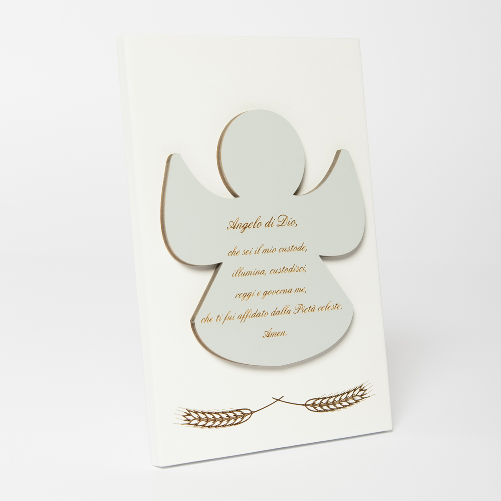 Cuadro sagrado con aplicación de un ángel con oración grabada. Panel de madera lacada en blanco con pie de apoyo. Aplicación en gris polvoriento.