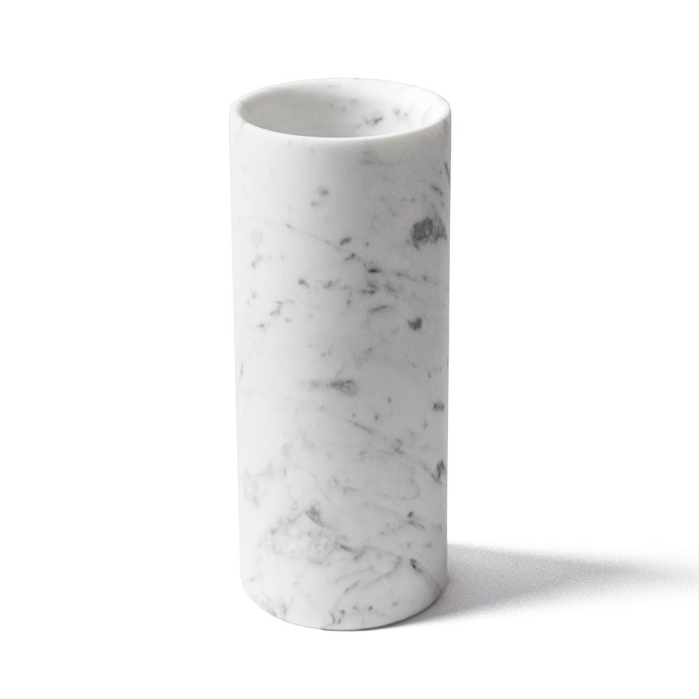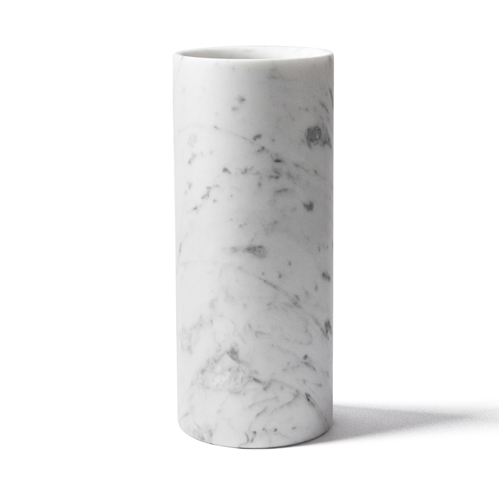 Jarrón artesanal en mármol blanco de Carrara con diseño cilíndrico hecho en Italia.
