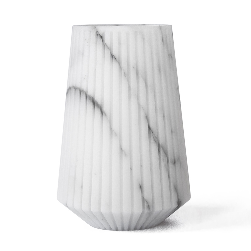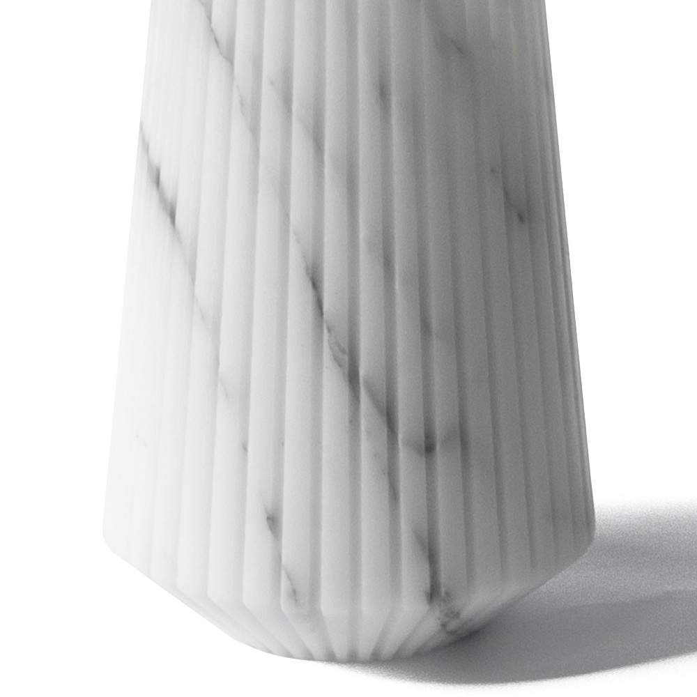 Este jarrón decorativo de tamaño mediano es un objeto de uso diario en mármol de Carrara finamente trabajado capaz de dar singularidad al espacio a través del diseño y elementos decorativos contundentes.