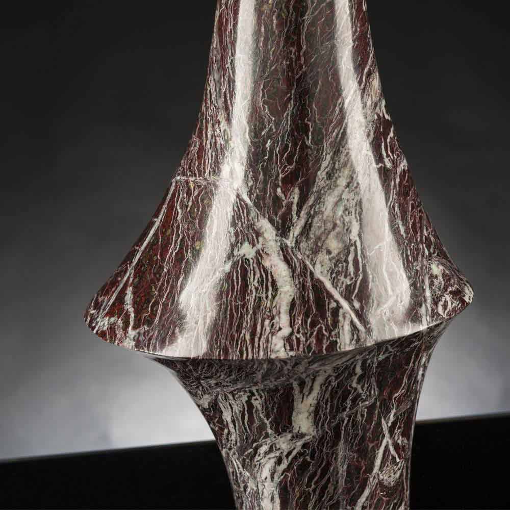 Elegante jarrón para interiores en mármol rojo Antico d'Italia, un prestigioso material violeta oscuro con vetas en tonos de verde y blanco elaborado a través de una producción 100% Made in Italy . Su producción se lleva a cabo mediante el procesamiento de piedras naturales con pantógrafos de 5 ejes que permiten obtener formas más complejas que los simples volúmenes de rotación. Este elegante mueble nace de la unión entre el estudio de los fenómenos naturales y la interacción de los materiales utilizados con la tecnología humana para dar vida a un estilo de mobiliario único y vanguardista. El resultado es un elemento decorativo exclusivo capaz de enriquecer cualquier ambiente con una estética moderna y refinada con personalidad. Un estilo ideal para los más variados ambientes, desde el mobiliario del hogar hasta el de hoteles, restaurantes, espacios contract, spas pero también como escenario para eventos y bodas.