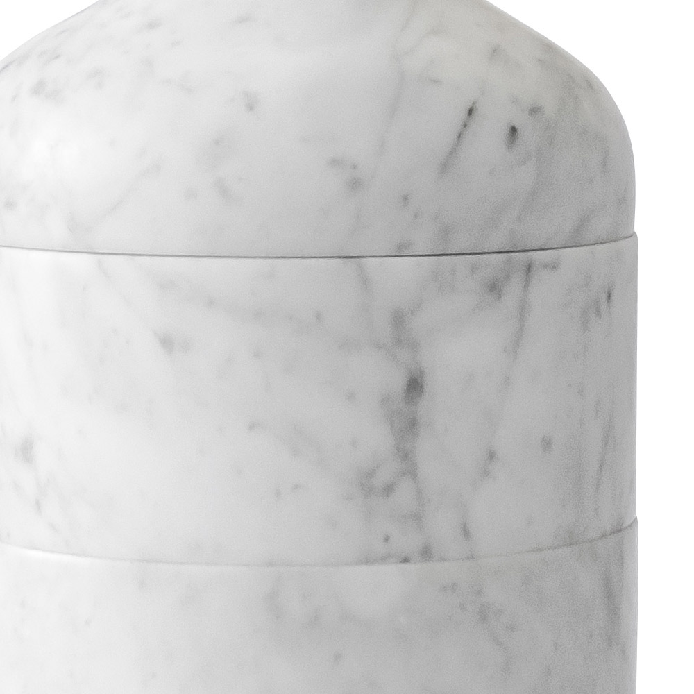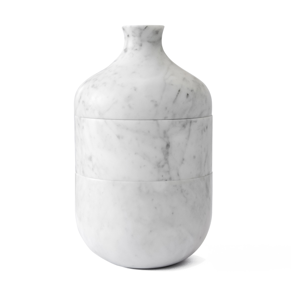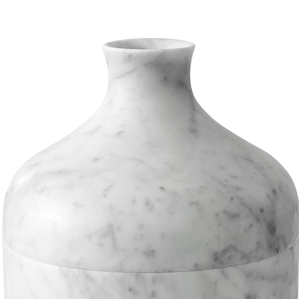Este jarrón decorativo presenta un diseño artesanal y lujoso dividido en 3 partes, íntegramente realizado en mármol de Carrara blanco satinado.