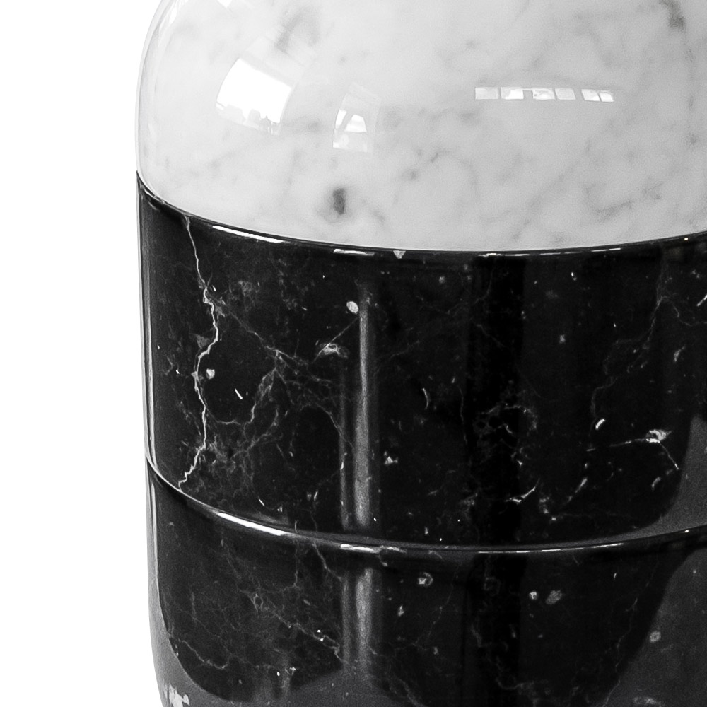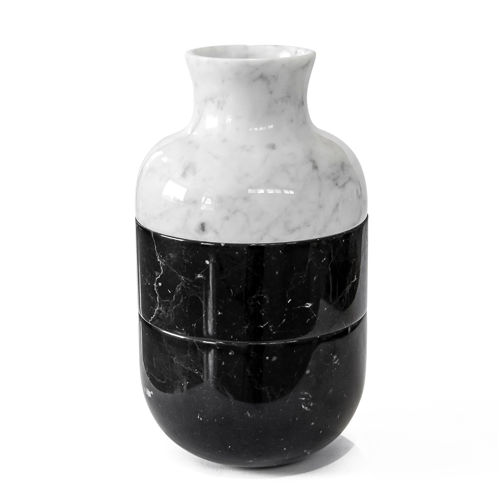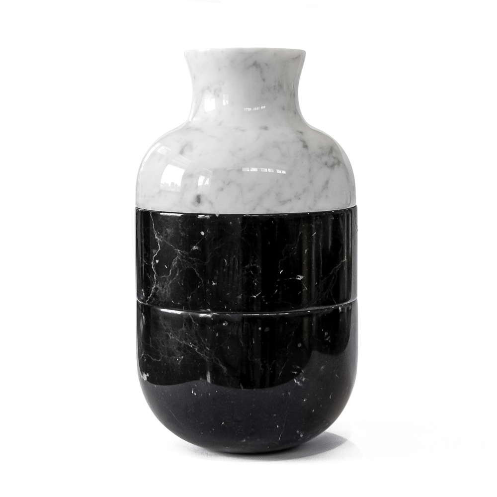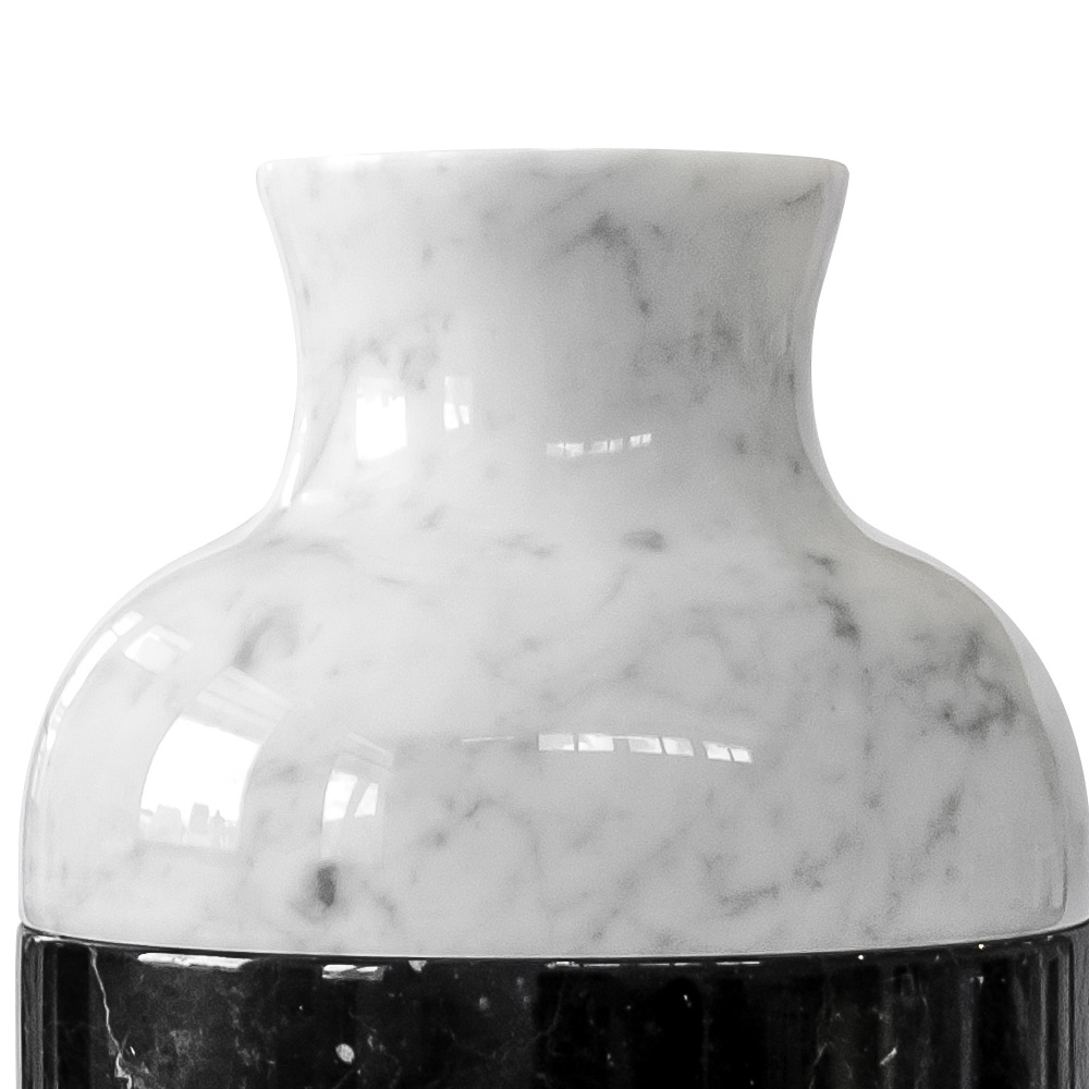 Este jarrón decorativo presenta un diseño artesanal y lujoso dividido en 3 partes, realizado íntegramente en mármol blanco de Carrara y mármol negro satinado de Marquinia.