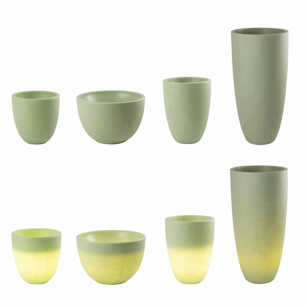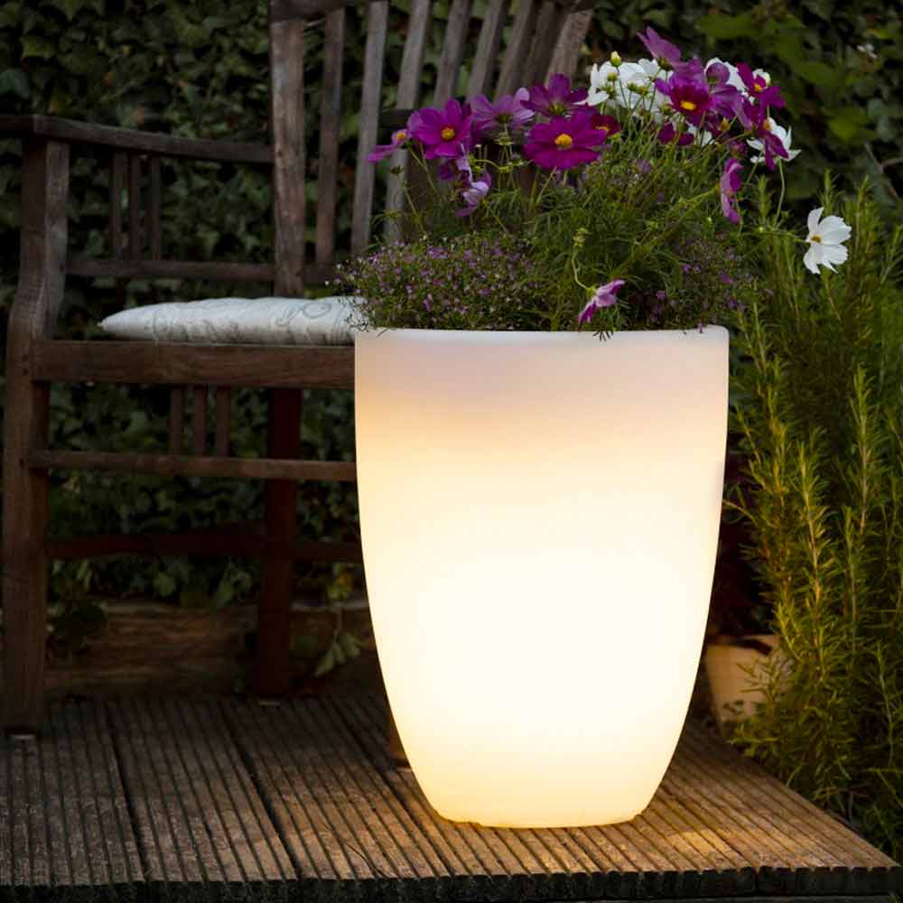 Florero luminoso y versátil para interiores o exteriores de colorido y moderno diseño con herraje E27 de diferentes tamaños.