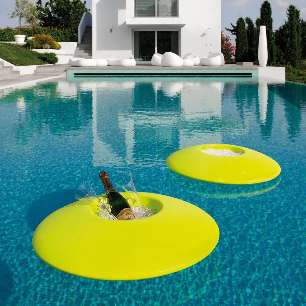 práctico contenedor flotante en situaciones como piscinas o spas donde, además de enriquecer de color el mobiliario circundante, ofrece una solución particularmente funcional.