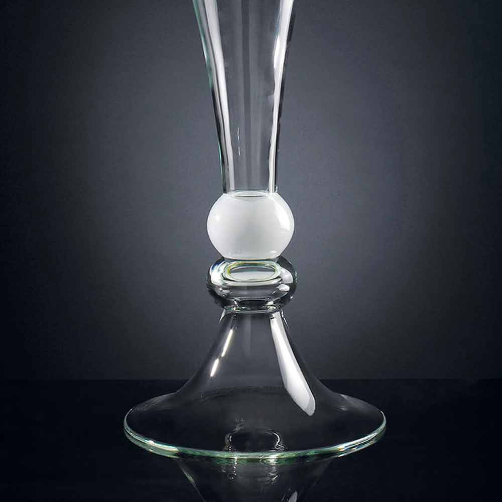Jarrón decorativo para interiores en vidrio transparente con esfera de vidrio blanco elaborado artesanalmente mediante un procesamiento 100% Made in Italy . Su peculiaridad está representada precisamente por la producción artesanal que aumenta su valor y valor para dar vida a un resultado exclusivo y de alta calidad , así como a un complemento refinado y con clase , características dadas por la elegancia atemporal del vidrio. Un diseño ideal para los más variados ambientes, desde el mobiliario del hogar hasta el de hoteles, restaurantes, espacios contract, spas pero también como escenario para eventos y bodas.