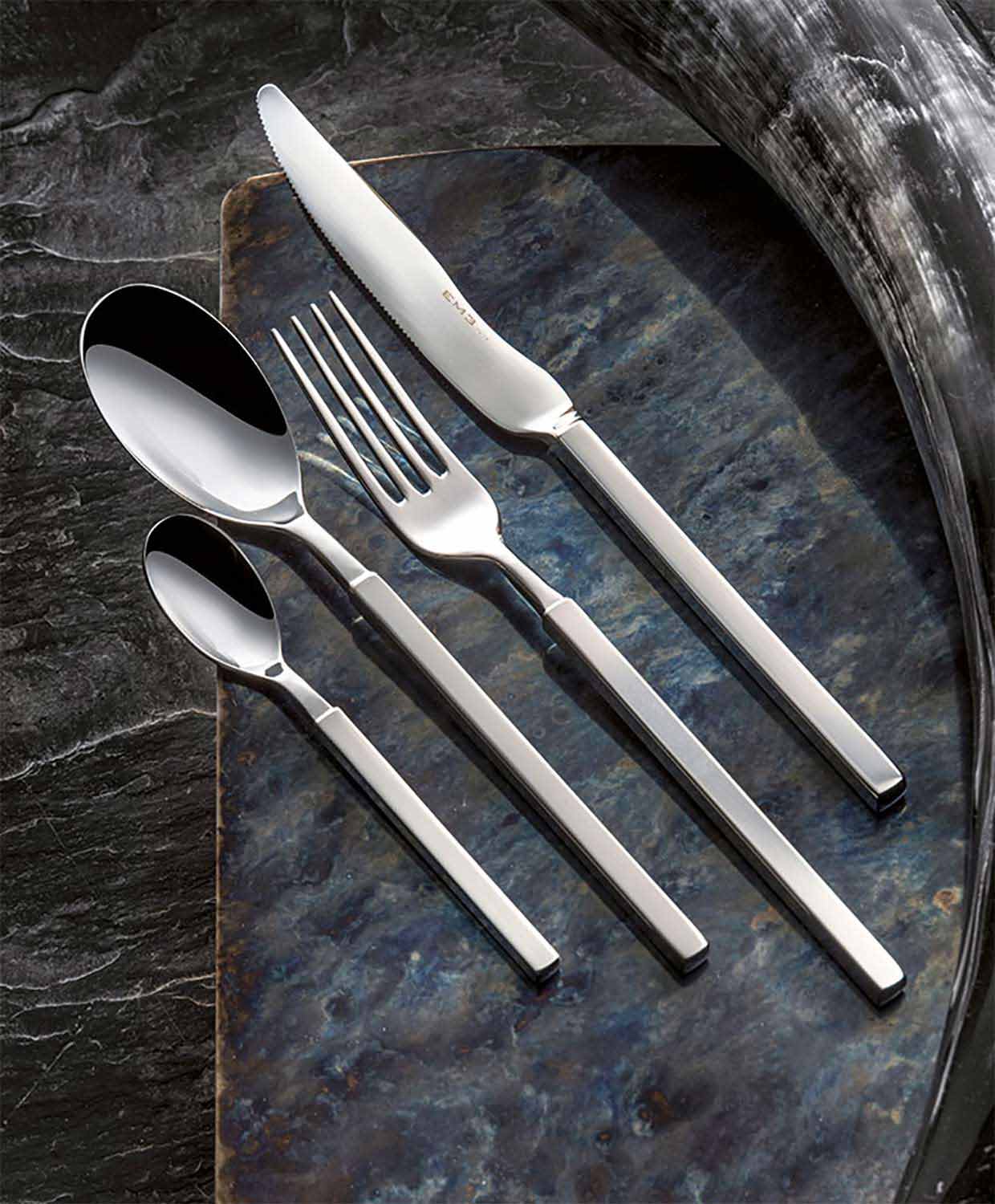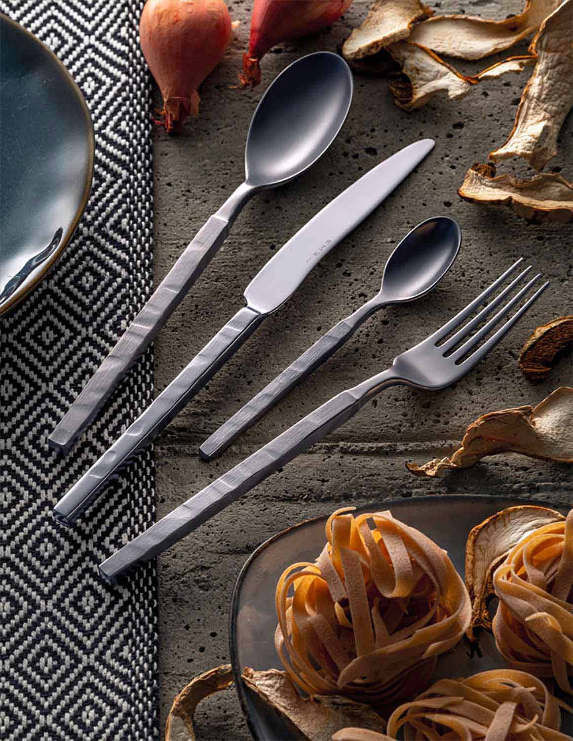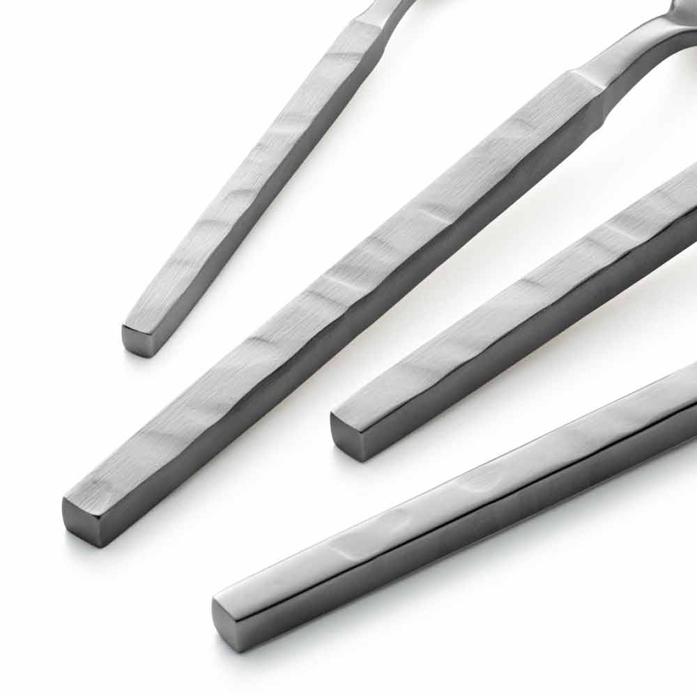 Fabricada en acero forjado, el diseño cuadrado y la atención funcional distinguen esta colección de cubiertos inspirada en los espacios urbanos modernos. Los