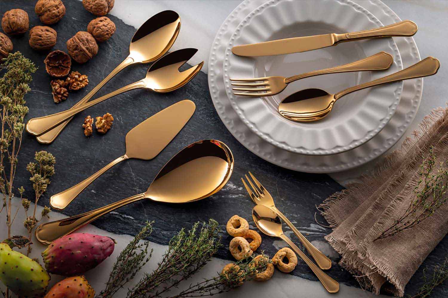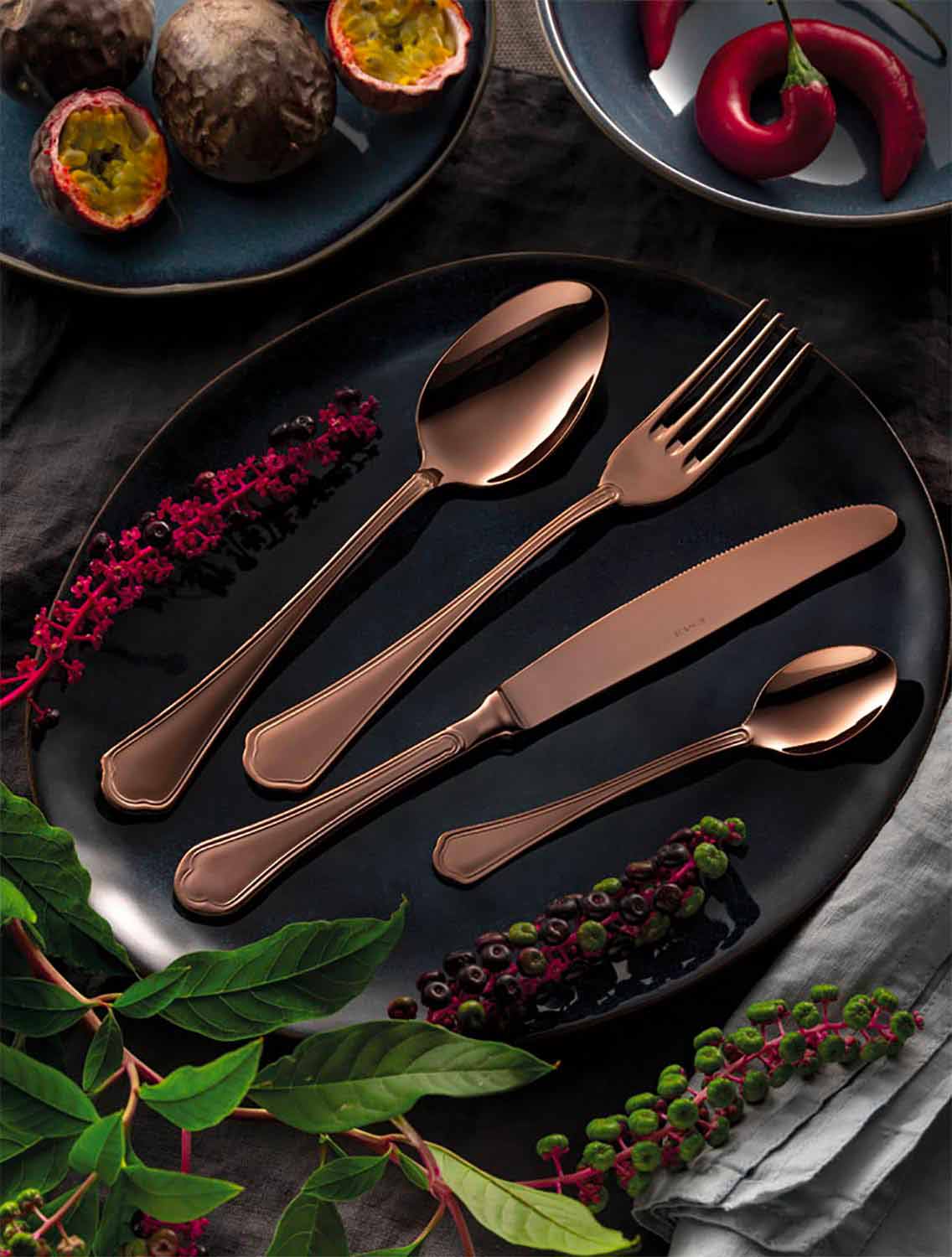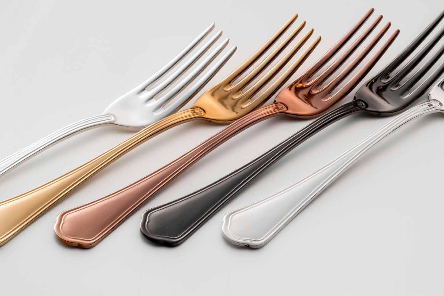 PVD es el acrónimo de Physical Vapour Deposition, que es una tecnología utilizada para colorear acero en cámaras de vacío especiales donde se rocían con vapor películas de metal muy delgadas, que se condensan en los cubiertos. Este tratamiento, con una gama de maravillosas tonalidades de color, además de embellecer los cubiertos, los hace más resistentes al desgaste y a los arañazos y es un recubrimiento perfectamente sostenible apto para uso alimentario.