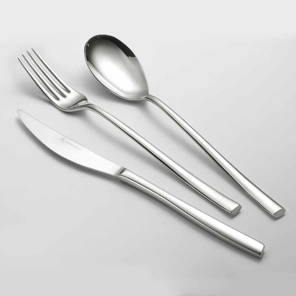 La colección está determinada por el refinado contraste de formas : las líneas sinuosas y suaves de la cuchara, y las líneas afiladas y elegantes del mango del cuchillo destacan sobre la mesa. Para concluir la escena, el mango de la cubertería termina con un corte limpio para un diseño único y exclusivo , con un toque moderno, ideal para ambientes de moda y refinados.