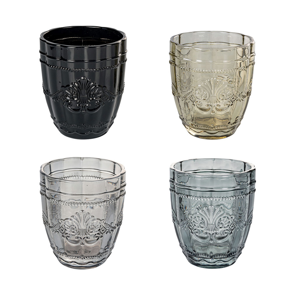 Este set de 12 vasos es un triunfo de la luz y el color , con tonalidades cálidas que recuerdan las maravillas de la naturaleza y los paisajes otoñales. Cada vaso es una pequeña obra de arte que trae consigo la calidez del color. Grabados con patrones que evocan adornos florales de épocas pasadas, estos vasos añaden un toque de elegancia clásica a cualquier mesa, celebrando la tradición del diseño .