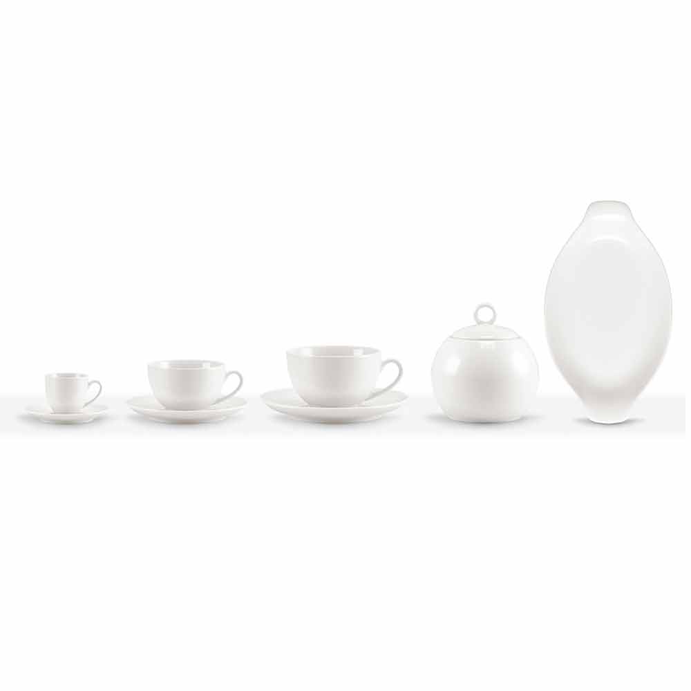 Servicio de tazas de café, té, desayuno con azucarero y platillo con un diseño moderno en porcelana blanca, 20 piezas.