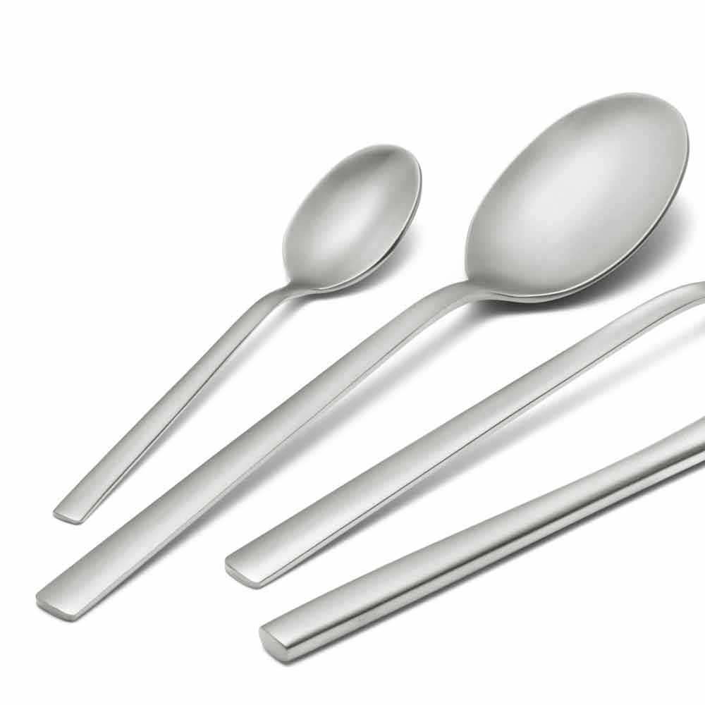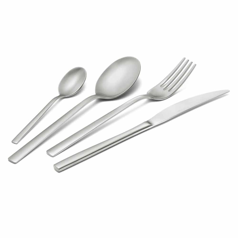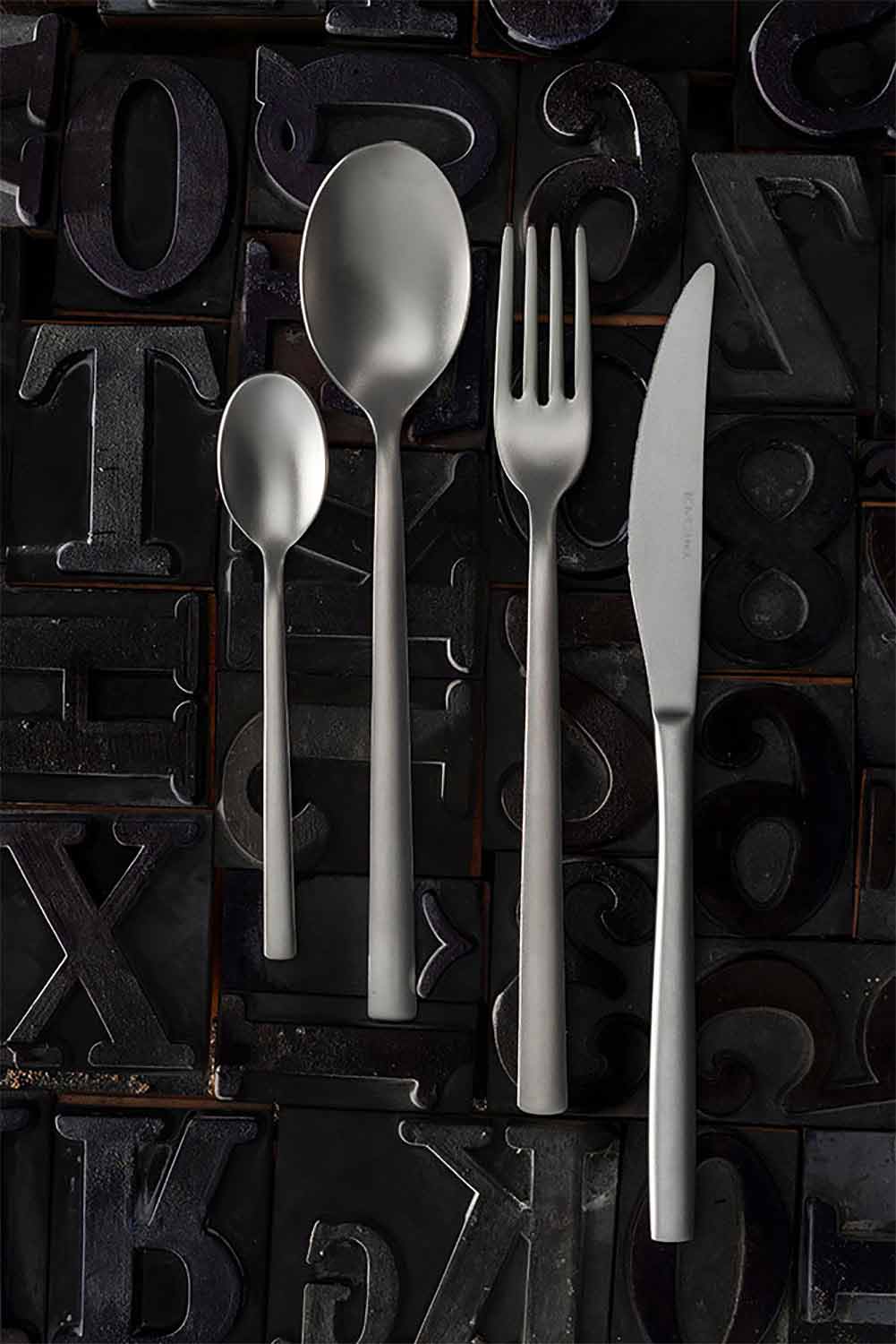Cubertería completa en acero inoxidable pulido con chorro de arena, 24 piezas de diseño made in Italy.