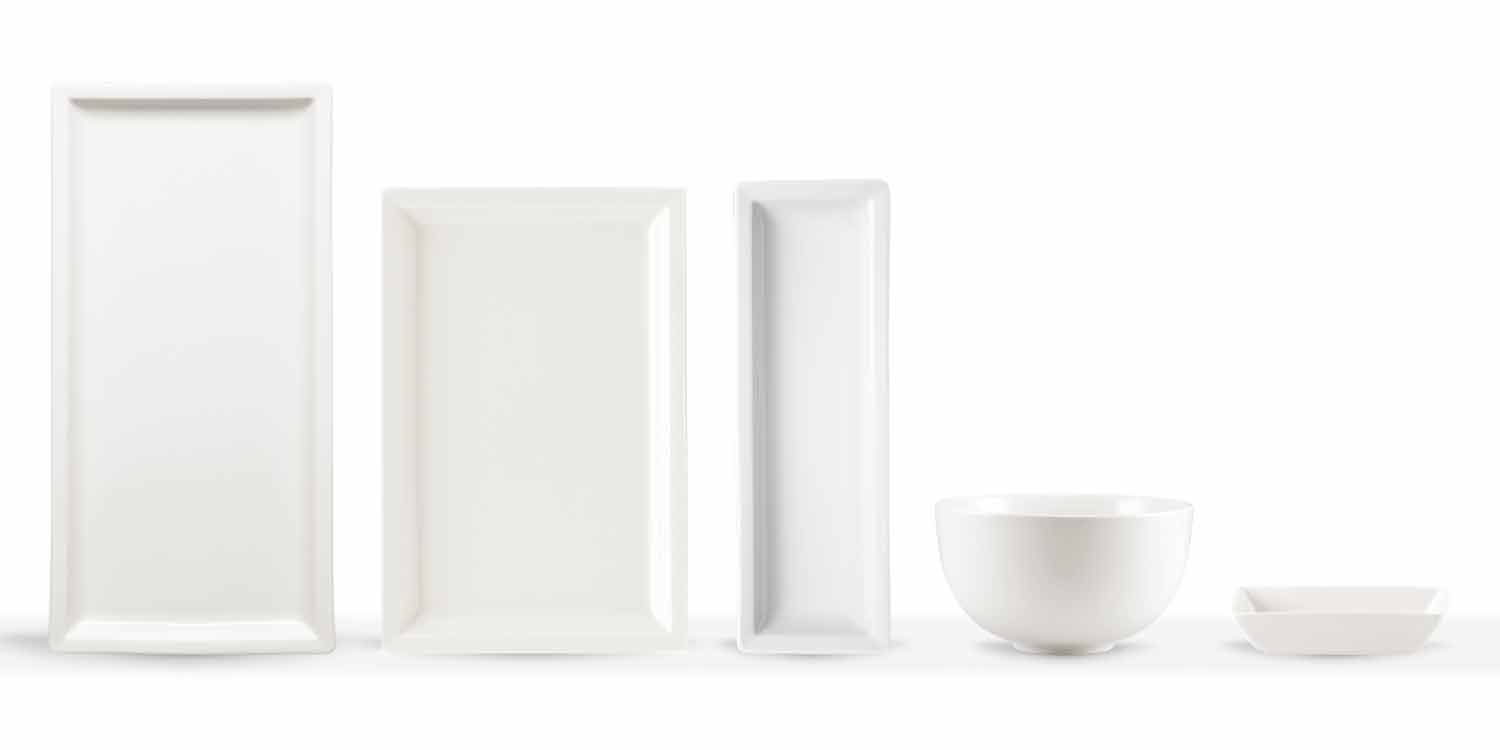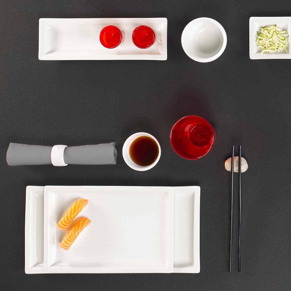 Platos para la mesa con un diseño moderno, en porcelana blanca rectangular, completa con 25 piezas.