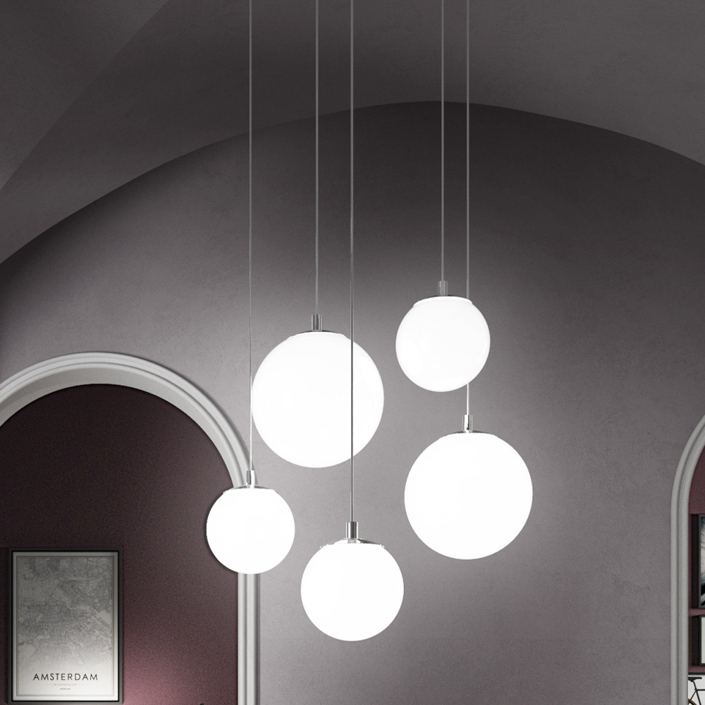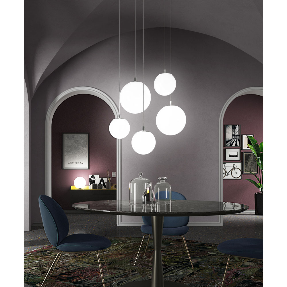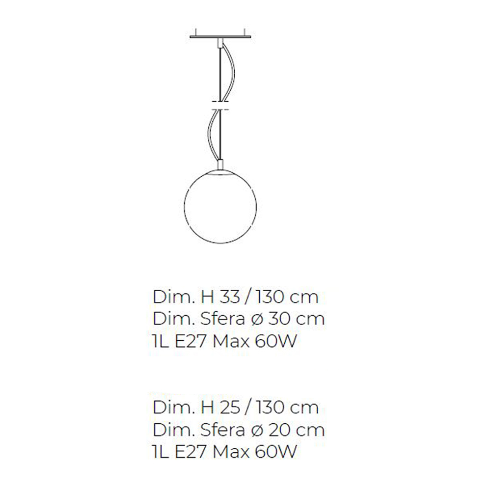 Un elemento decorativo de fuerte impacto escenográfico realizado en vidrio envuelto soplado a mano y singularizado por los maravillosos juegos de luz creados por la forma esférica del difusor y el particular procesamiento del vidrio.