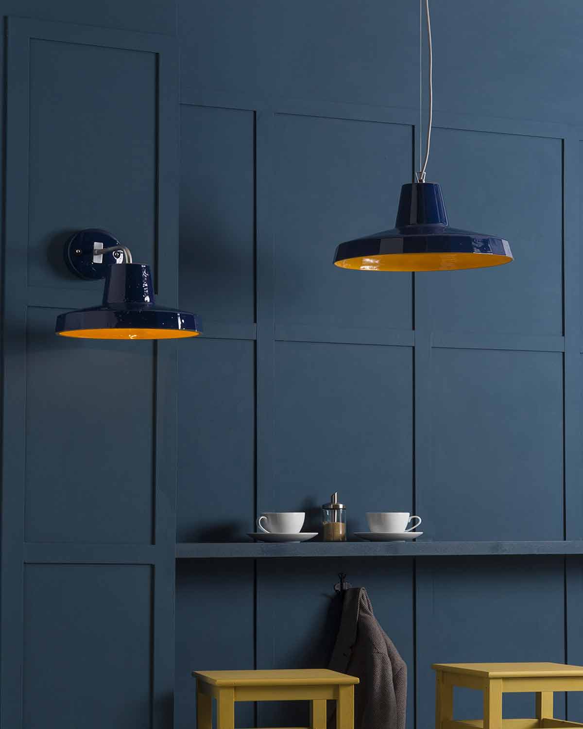 Suspensiones, techo y apliques revividos, pisados en mayólica toscana, requieren dos pasos en el horno a 980°.