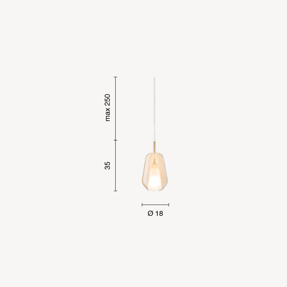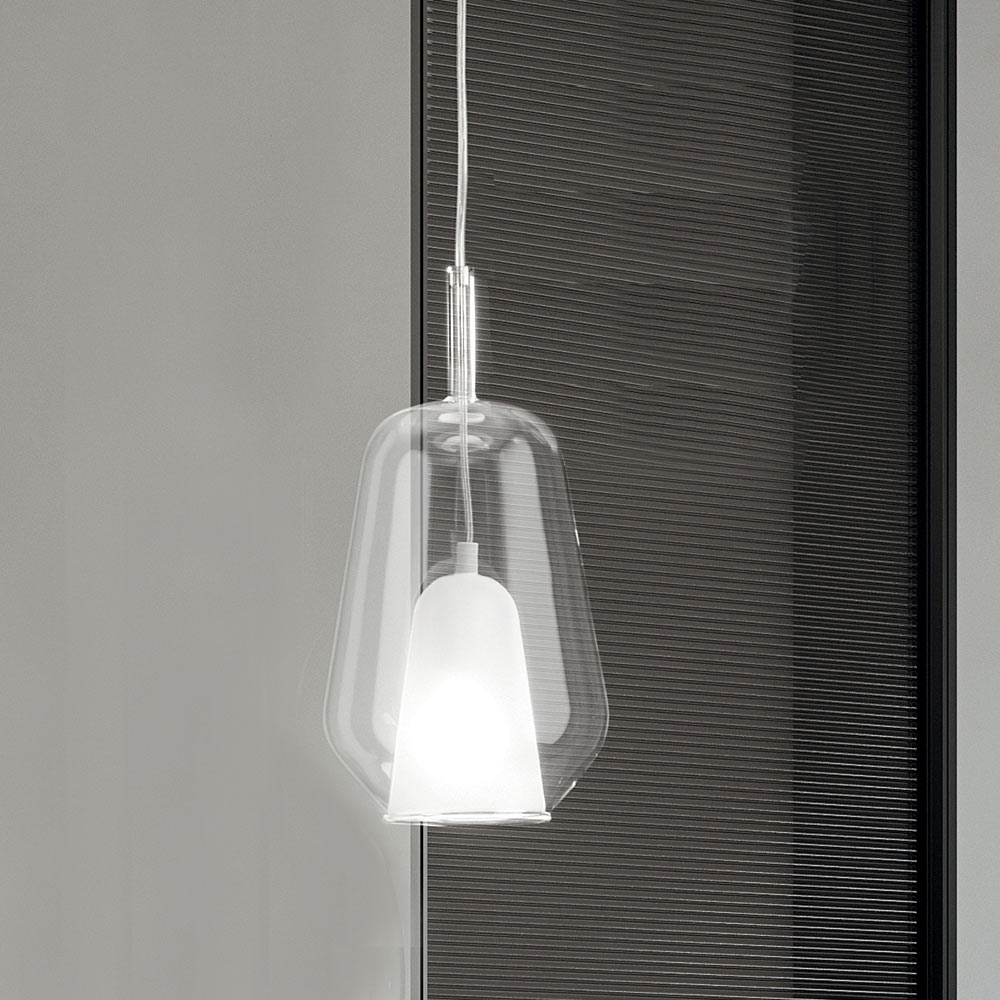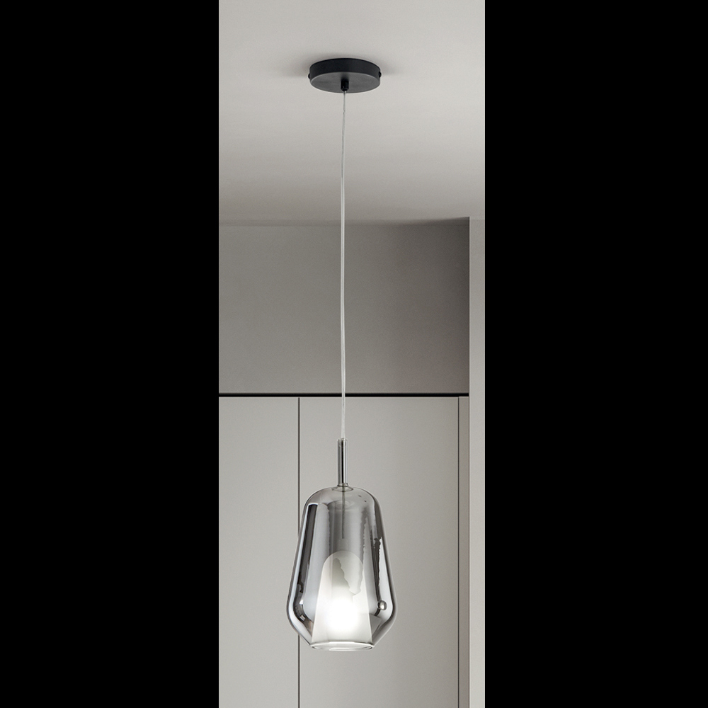 Lámpara realizada con base de techo de metal y difusor de cristal soplado , caracterizada por una doble capa: interna en cristal satinado y externa en cristal coloreado . Casquillo en material polimérico para estabilizar el cable en posición central. Cable orientable.
