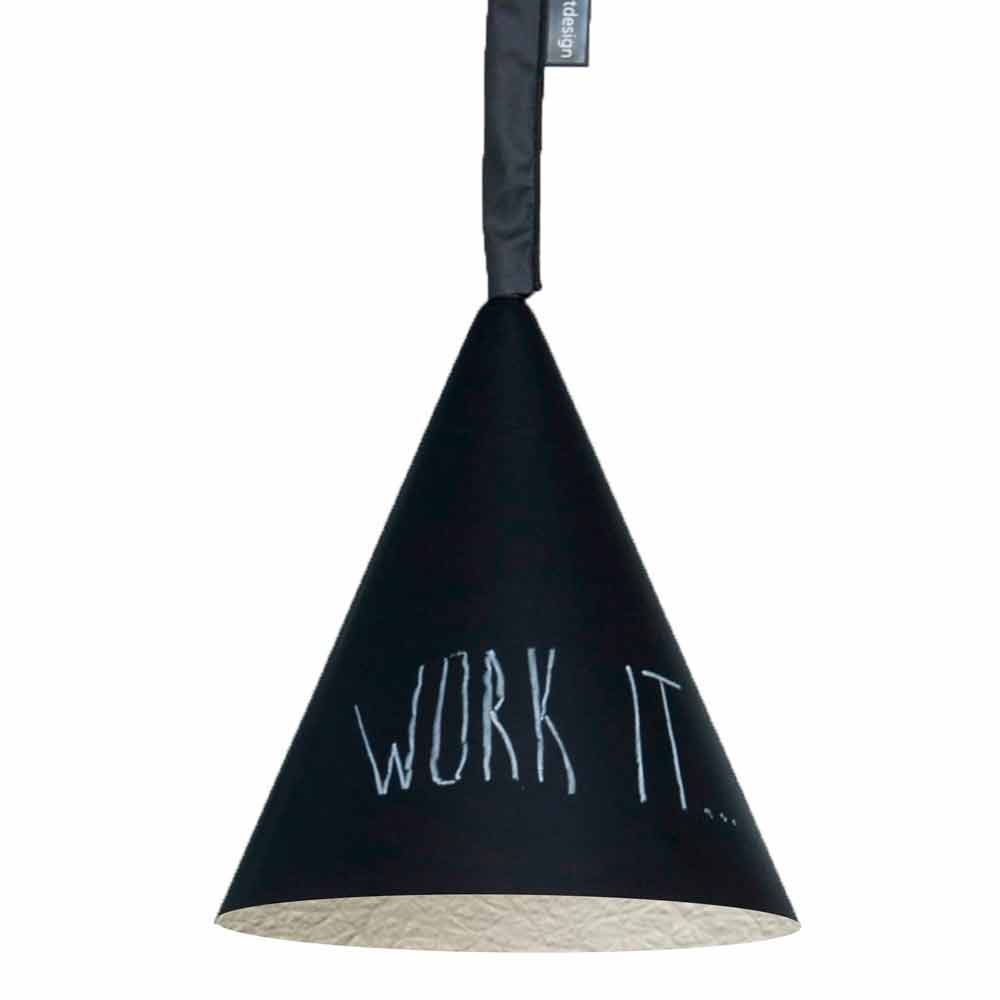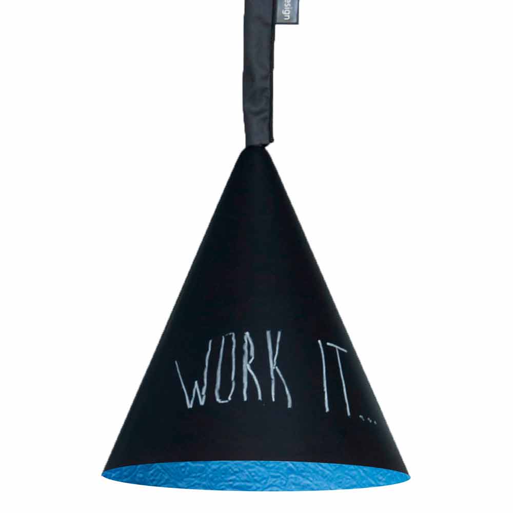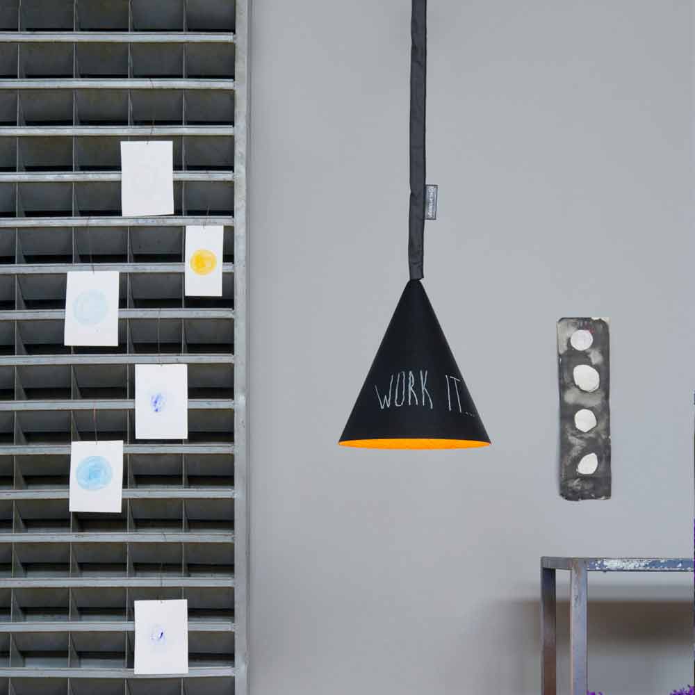 Una característica peculiar de la lámpara Jazz Lavagna es su superficie, diseñada para ser escrita y borrada, como un pizarrón real.