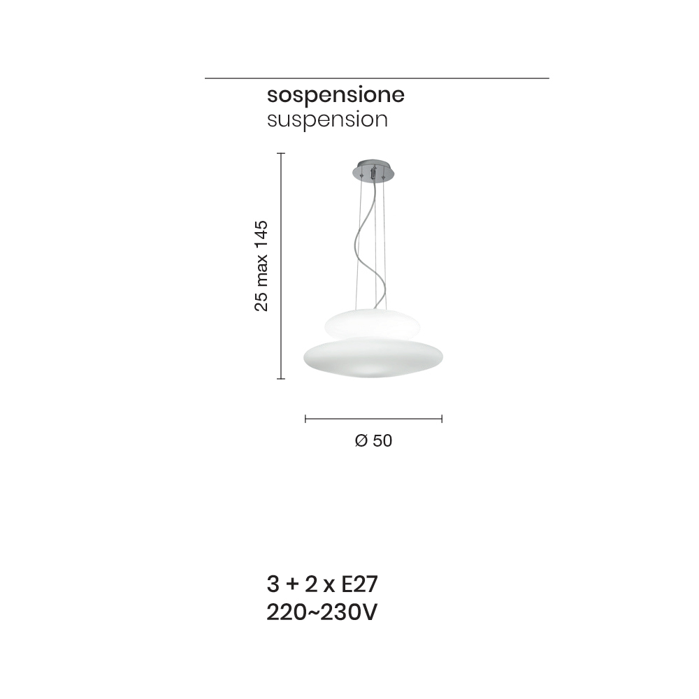 - diámetro 50 x H 25 cm - H max 145 cm (3 + 2 x E27 220-230V).