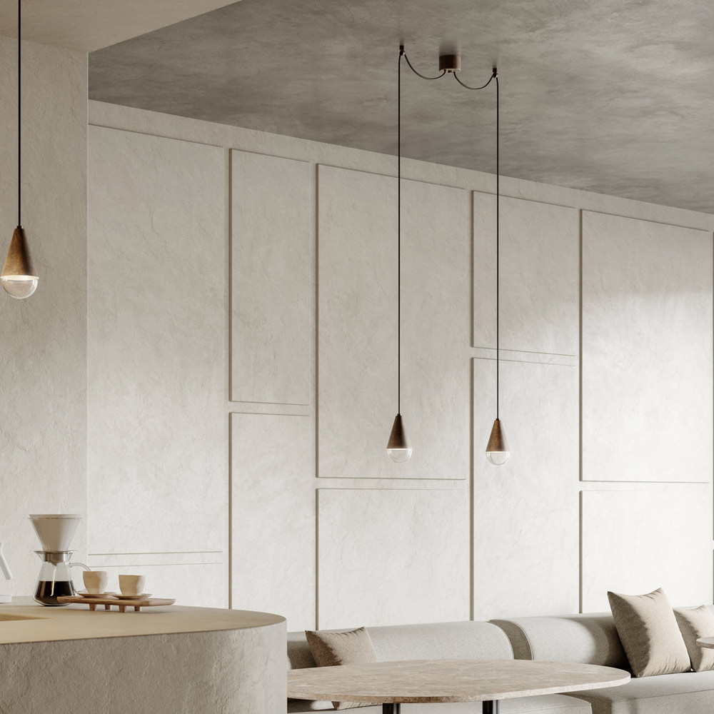 Made in Italy. Las líneas limpias de la colección de lámparas de interior resaltan la pureza del material hierro. El elemento colgante se puede utilizar solo o en combinación con otros, para crear composiciones lineales o agrupaciones con efecto escenográfico.